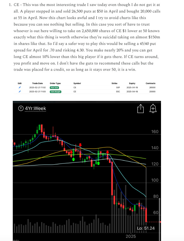 CE - in friday’s recap here I noted this Celanese trade and mentioned it being the most interesting one I saw that day because of the size. To sell 26,500 puts basically at the money and buy 20,000 calls you had better have some serious conviction and this player was dead on, that 51.24 price when I took the screenshot friday was the low basiscally and it has rallied almost 10% in 3 days since to 55 at the open and has given some back to 53.50 right now, but still up nicely from friday. Mind you that was through 2 of the nastiest days our market has seen in a while. This was an insane trade and the size and proximity to the current price was a major tell of why it should bounce.