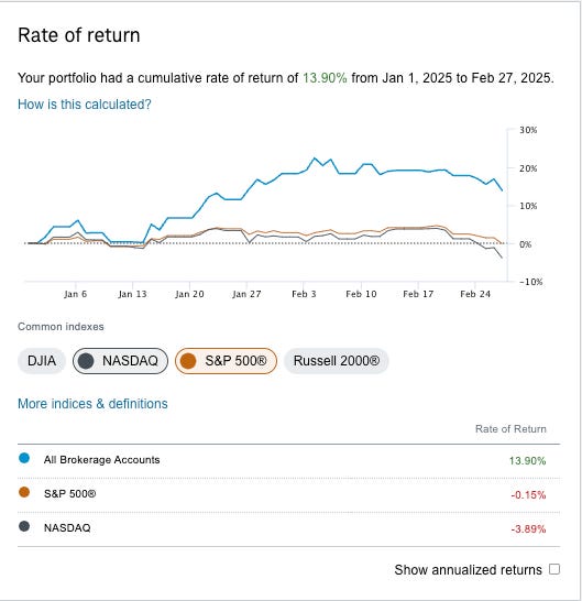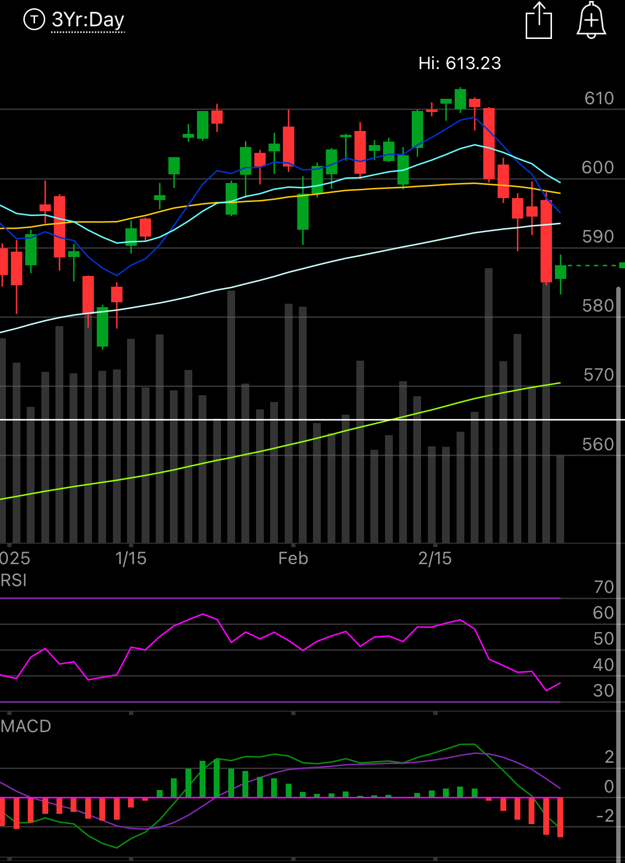 You’ll notice I took quite a hit yesterday afternoon in that drawdown with my short puts, not really a concern to me, as I said in the note last night, I’m going for long term capital gains on these leap short puts, unfortunately what the market does day to day impacts them, but they’re nowhere near being assigned. I added some more TLT yesterday as I mentioned and trimmed some of the short tech puts I had that were eating up my margin. So far that is going well for me today, monday is the ex-div so by friday next week I should have a nice payment sent my way. Otherwise I only added a small put sale on MSTR for next week where I’d be assigned below the 200 day. For most names, they will bounce off the 200 and that is where I want to take shares and begin to sell juiced up calls vs it. I’d had to trim a little TLT if it looks like I’m going to be assigned, but that is fine with me.