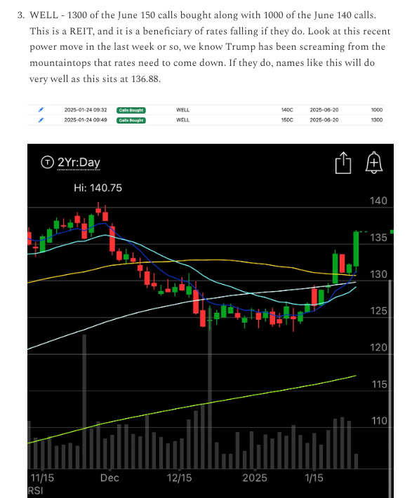 WELL - In the 1/24 recap here I flagged these 2 call buys on WELL, it was a REIT I had never heard of and there was nothing else in my data on the name. It has since rallied 11% to 151.90 and these obscure call buys continue to be great alpha.