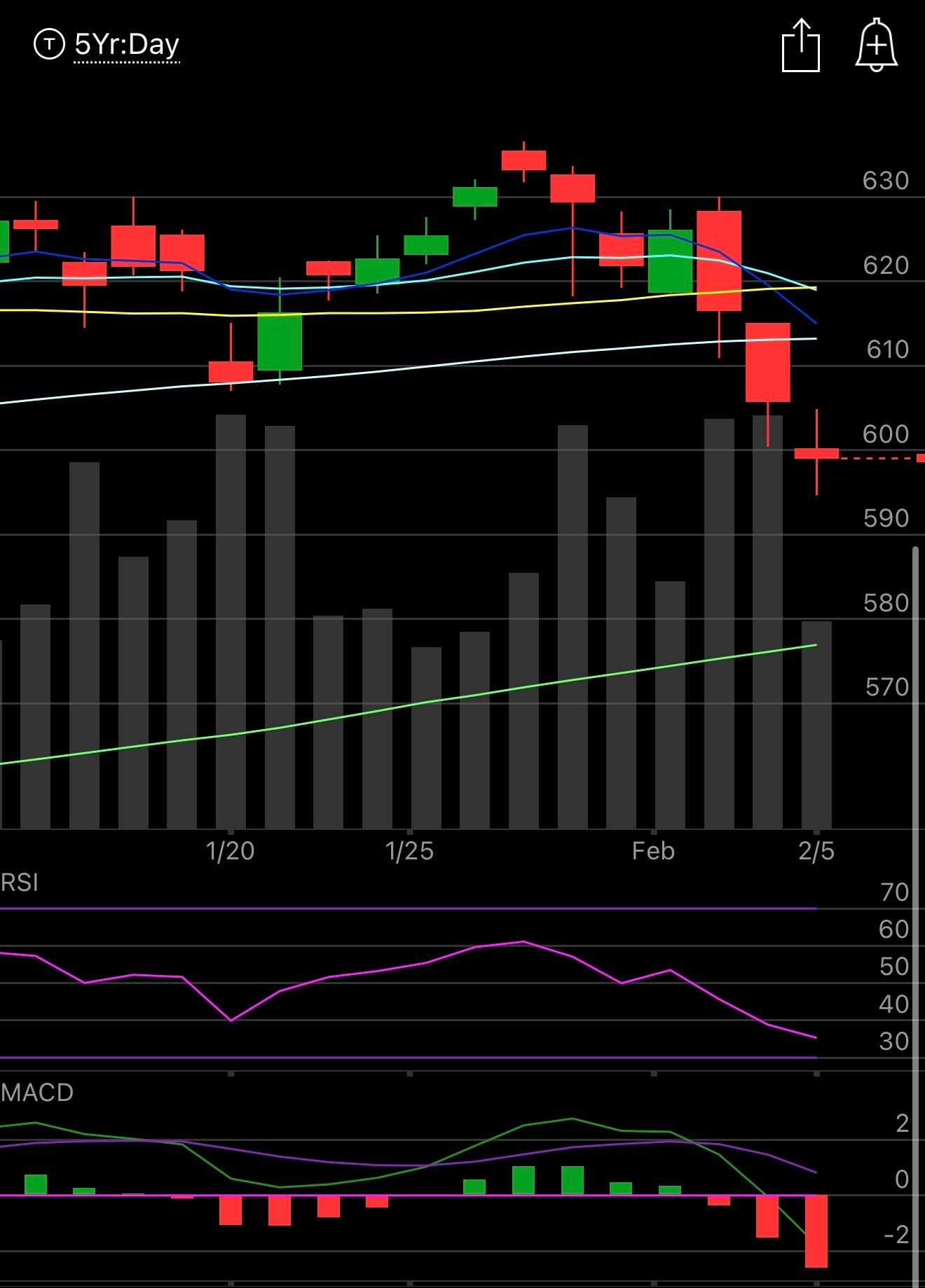 Tech stocks are in a continuation of yesterday and the move after the close below the 100 day yesterday shouldn’t really shock any of you. This is officially a downtrend for tech stocks, you can see the 8/21 crossover above to the downside 3 days ago and while things are firming up a tad now this really probably doesn’t end until we test that 200 day whether its down at 580 or we go sideways for a bit and it comes up first. Of course it won’t be a straight line down, there will be bounces but until we see a reclaim of the 21 ema way up at 620 and sloping down, we’re in a downtrend. What would save this market now? All the megacaps but AMZN and NVDA have reported, Google had a strong report and boosted capex into the stratosphere and that still didn’t change much. This is just a complete wrecking of levered longs and you’re seeing it in crypto, metals, and tech stocks where everyone is levered up. Silver down 15% today, bitcoin down 8% are showing you where the blowups are happening. So I wouldn’t look at this as a fundamental blowup, but more of a technical one with things just accelerating to the downside after a major breakdown of tech stocks,metals, and crypto all at once. Those led the way up and they were all so crowded that they wiped out many on the way down.