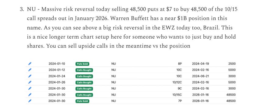 NU was the one I wanted to discuss today, back in the 1/30 recap I noted that monster risk reversal with the stock just below 9 and a player sold 48,500 puts at 7 in 2026 to buy 48,500 call spreads using a 10/15 call spread. The stock is up over 30% since to $11.62 right now.