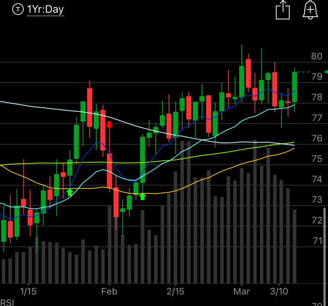 Oil, below, also made a big move up nearly 3% today, still though, it has not been able to close over the $80 level in a very long time. Copper is another commodity that has been on fire recently. The commodities rising is not any help to inflation and what the fed wants to see happening.