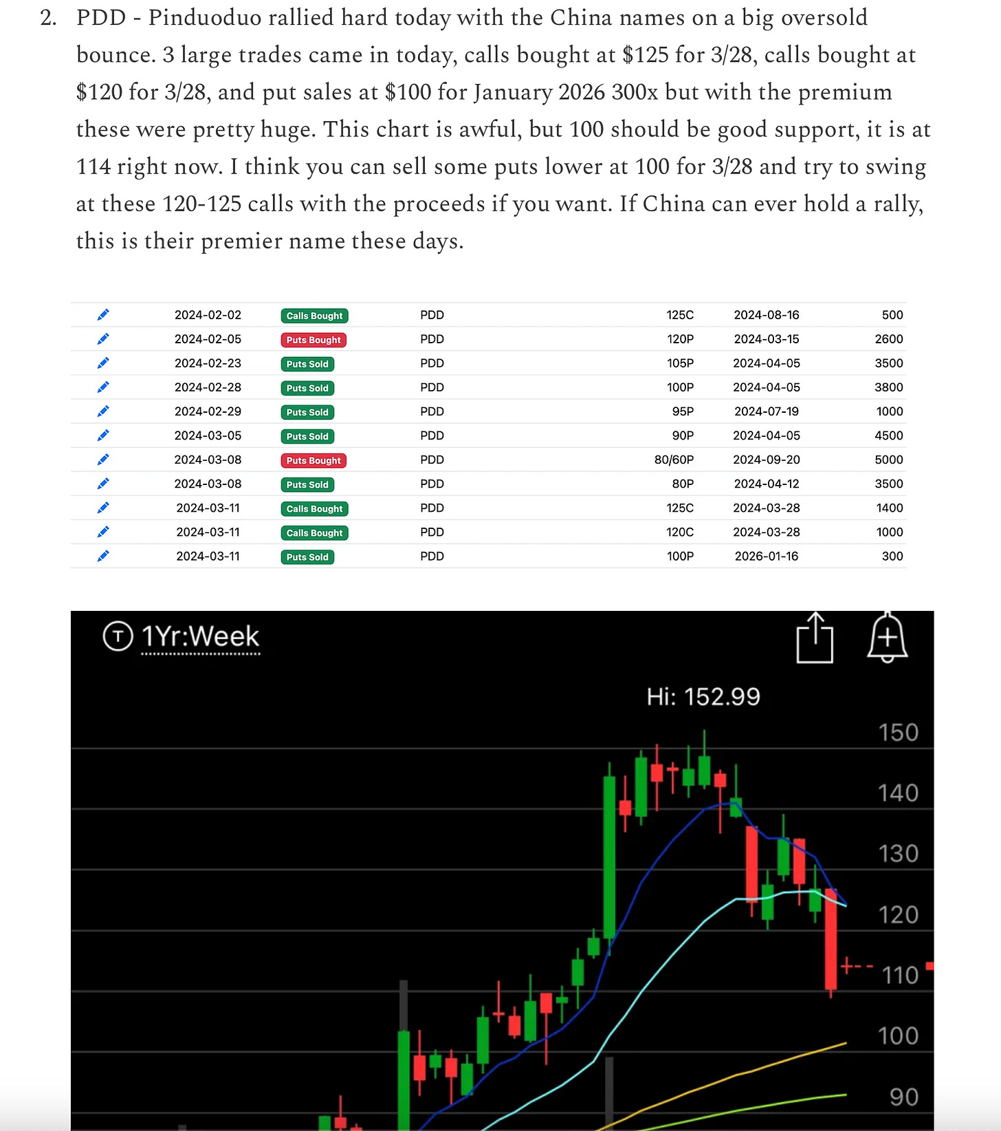 I highlighted all the PDD calls and put sales that came in on 3-11 in the recap below and PDD hit near $150 today before a monster fade. Even so it’s still $129+ now and it was 114 then. It has made a really nice move up. You had a chance to cash this well over 140 this morning which would have been a huge gain.