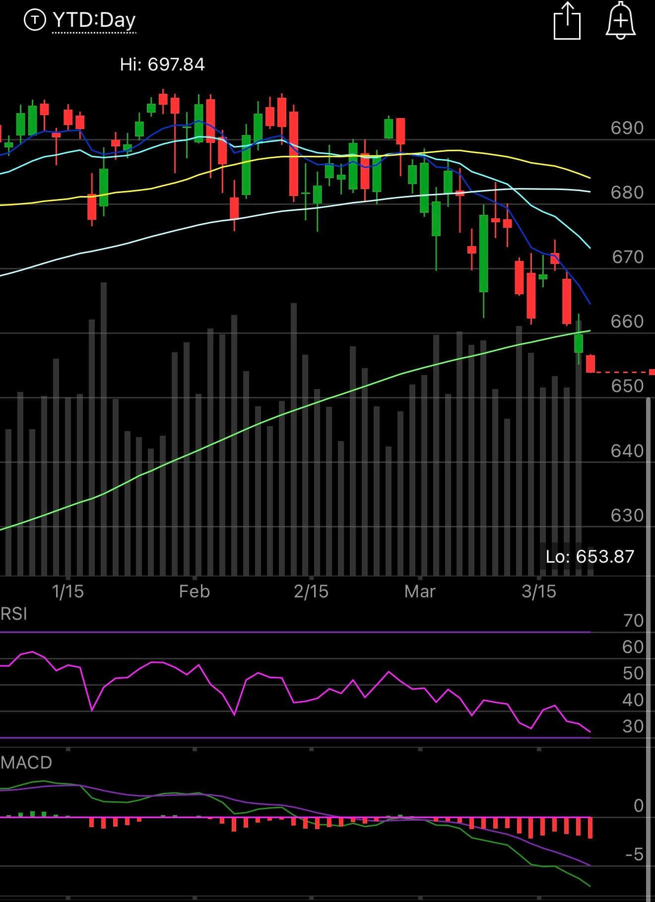 As for levels to watch, the SPY is now on its second day below the 200 day this is simply a downtrend, as I said yesterday, do not fight it, you need to see the 8 ema and 21 ema come down, flatten out, and be reclaimed before you can think about longs and a sustained uptrend is not a serious consideration until that 200 day above is reclaimed. This is major carnage right now and you can see yesterday how even with that huge late day relief rally we closed right under the 200 day. That was a perfect trap of the bulls overnight. 660.39 is the 200 day on the SPY right now and we’re taking out yesterday’s lows at the moment, not good.