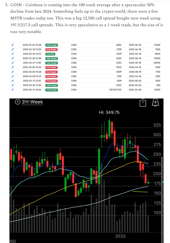 COIN - In friday’s recap I flagged these Coinbase call spreads expiring this week the name is up almost $30 since to 206.xx and these call spreads are up a few hundred percent in 2 sessions. Very nice bounce off the 100 week.