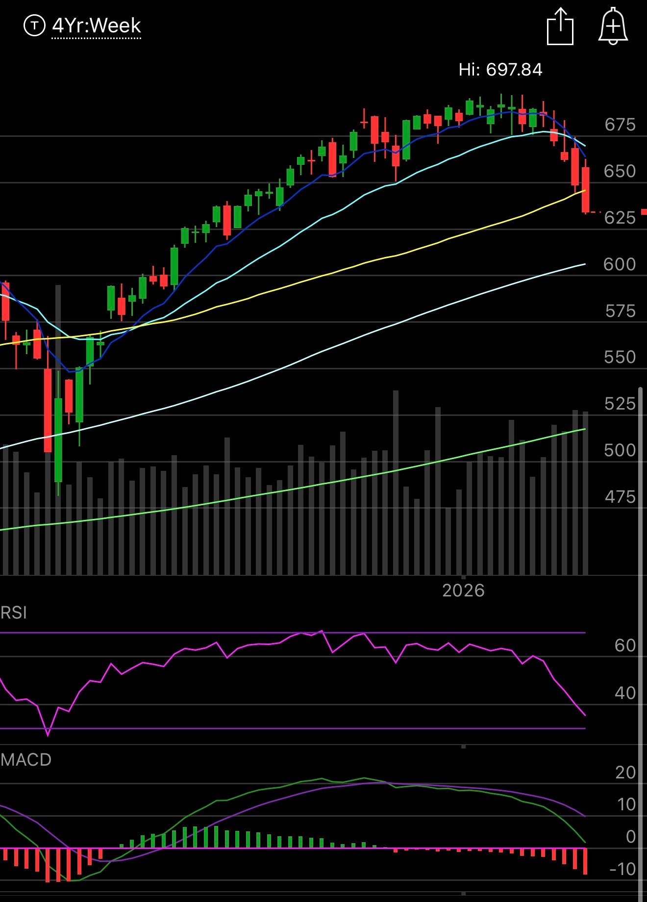 The SPY wrapped up about as bad a week as we could have imagined closing at the lows while knifing through the 50 week. This is what was concerning me when I titled the post “ It’s time to be cautious” here on March 13th. The reality is these 8/21 bearish crossovers on the S&P and Nasdaq are rare, this is our 4th in 6 years, but every single one is followed with a vicious move down and this one did not disappoint. Now we begin to wonder will history repeat soon with a Trump pivot at the 100 week below like he did in 2025?
