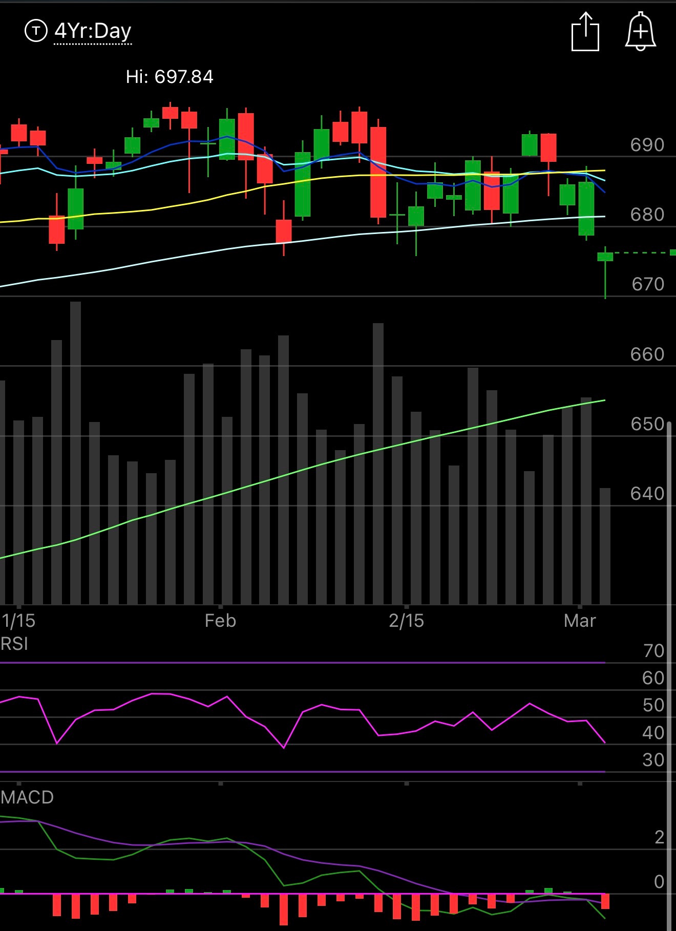 The SPY gapped down below the 100 day for the second straight session, once again we have recovered slightly so far but you’re starting to see moving averages slope down and that is not ideal. You saw the contagion from margin calls today where even energy names were red. The VIX was up 25% this morning at one point but has cooled off to +16% right now, anytime the VIX approaches 30 is usually when you want to start adding and we topped out just over 28 today. The weekly chart shows us losing the 21 week for the first time since April today, not good at all. Rates are rising and causing all sorts of chaos. A reporter, Guy Elster, says according to Trump this war could be over in a few days. That would be the most ideal scenario for bulls. You can see the panic in the database, today is one of the few times all year you will see more notable put buys than call buys, we’re in a spot where there is panic. Look back at the last 100 years, these things happen, it always feels like the end of the world and we always resolve higher, just relax and don’t overdo your short term options or leverage.