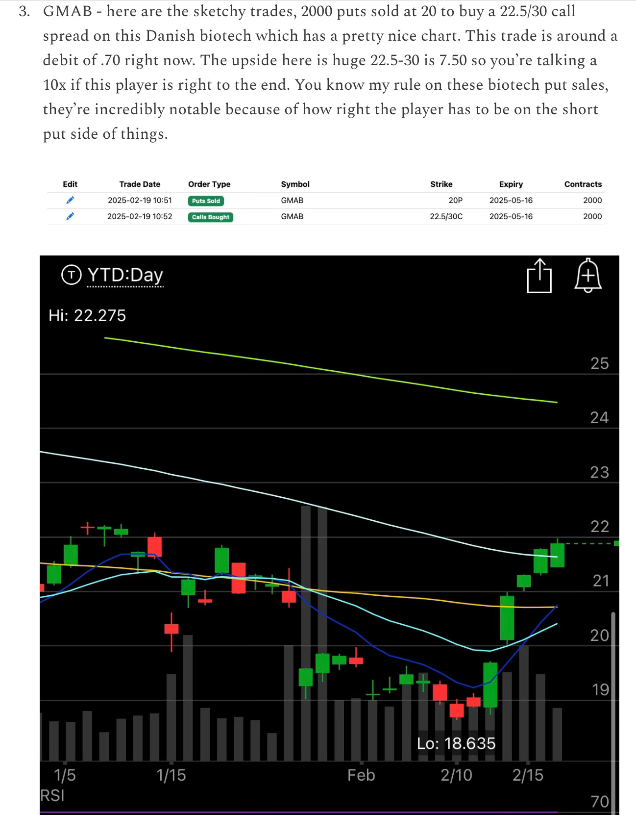 GMAB - Up 2% today and 6% since I flagged it in the 2/19 recap here . This was a weird risk reversal on GMAB and it has performed well since the rest of the market has been in complete shambles.