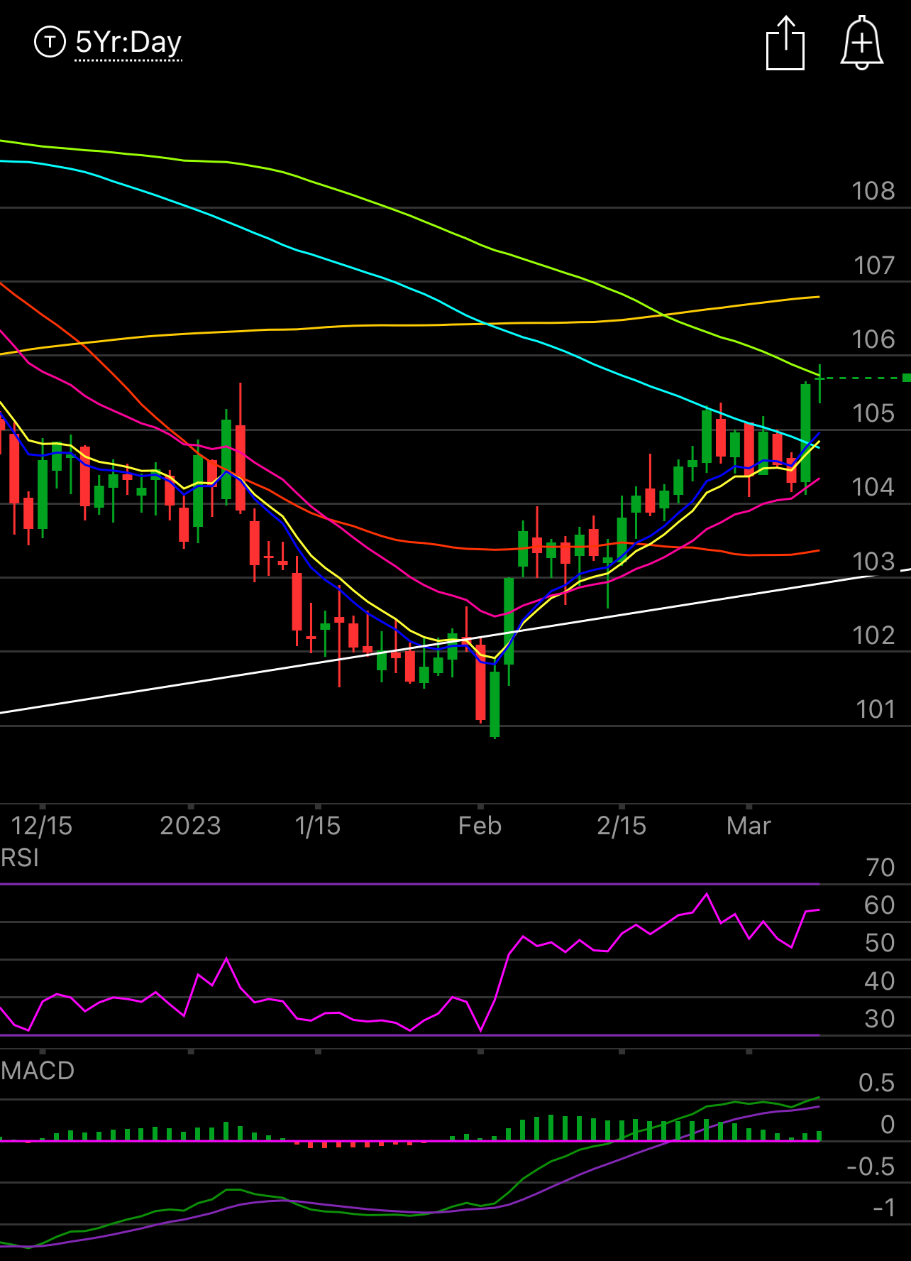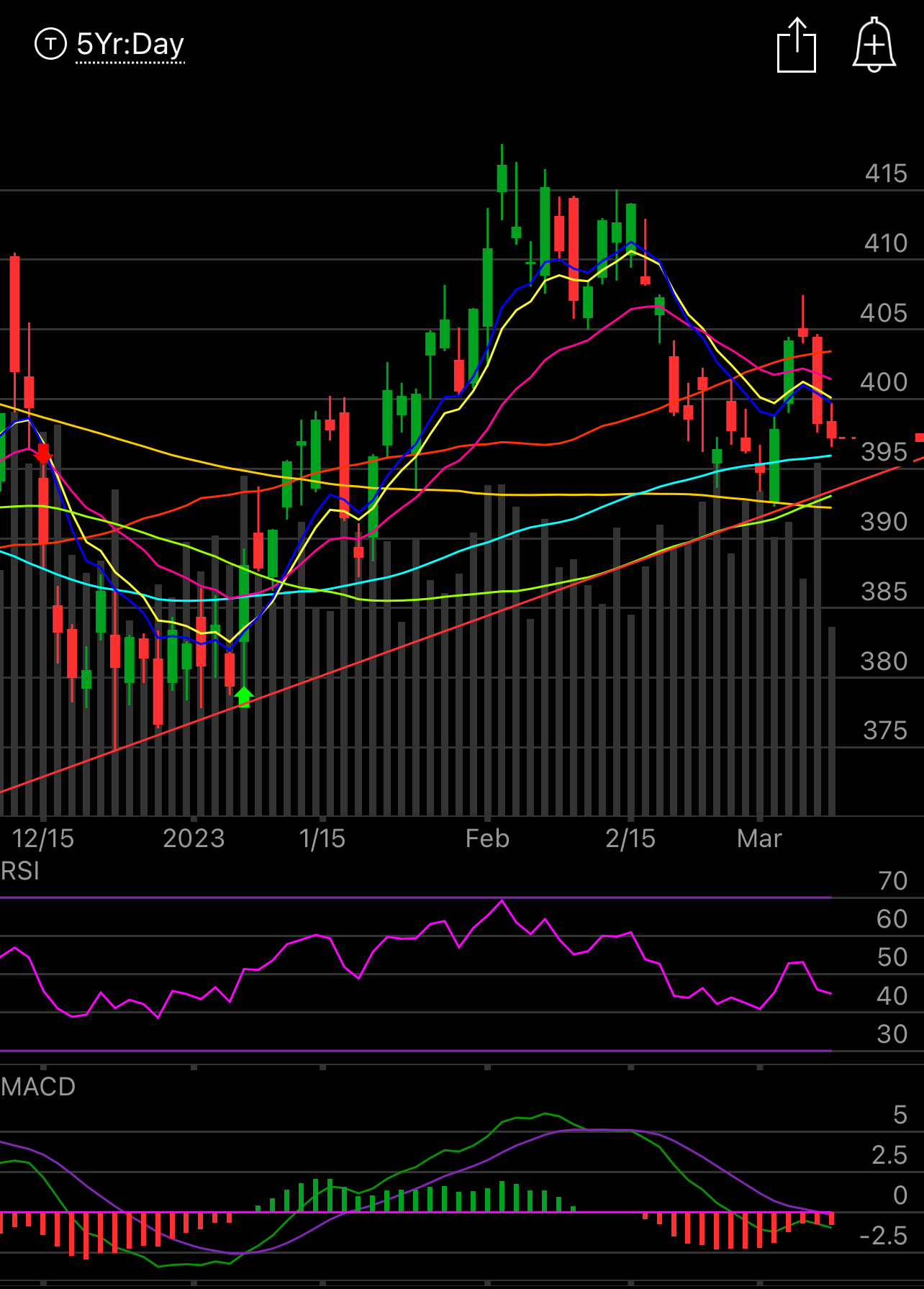 We continue to trade weak below a lot of key moving averages but mostly flat as I write this. The market likely won’t do much until we get this payroll number Friday and that should decide whether we’re going to finally break this multi month uptrend or continue higher. As you can see below we’re heading right back to that trendline where we last based and bounced in December. In yesterday’s recap you can see it going back October. As we continue to languish below al the moving averages including the 8/10 ema, weakness will persist. The MACD and RSI both remain in positions of vulnerability and there really isn’t much to say other than we’re still in an uptrend, but we’re on the edge of falling into the abyss. I still stand by my January 1 call that this remains a year of no significant returns. As we go sideways, those who sell puts will do great like us in here, the rest of the market will just be chop as we absorb one bad datapoint after another for the rest of 2023.