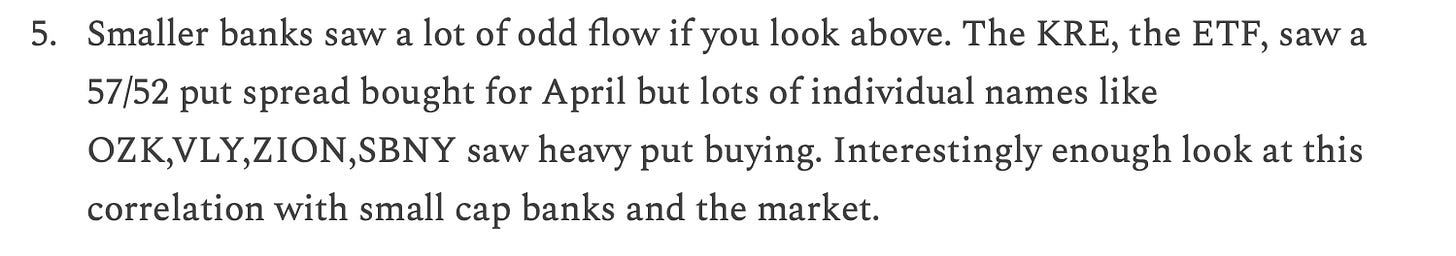I wanted to get this out early enough to where you all had time to decide on what you wanted to do into tomorrow. Let’s start with yesterday’s recap. I mentioned in my highlights that there was some serious put buying going on in the KRE and small banks