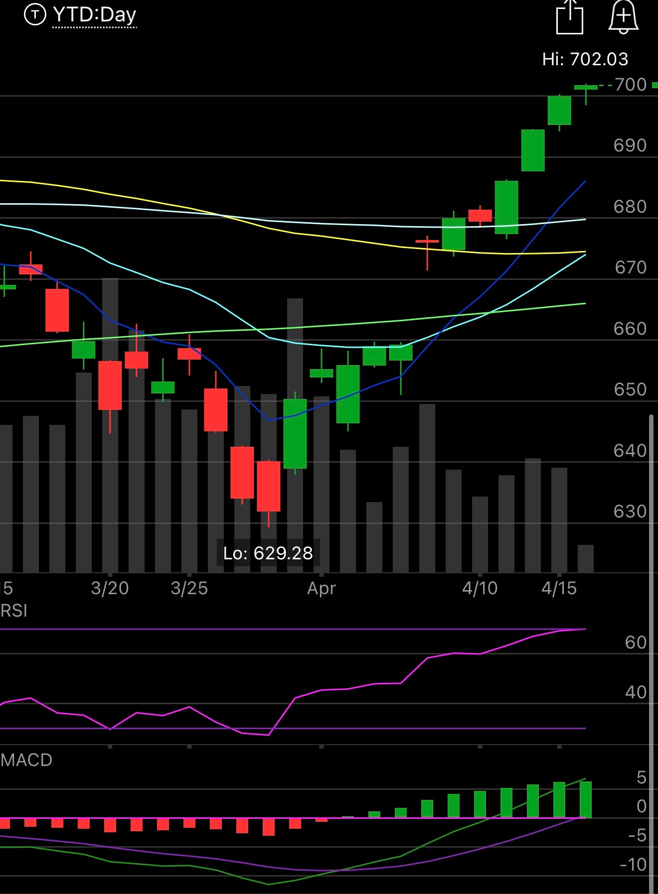 The SPY is at new all time highs, if you’re bearish, stop. Are we extended? Sure, but there is nothing bearish about new all time highs. We have earnings season really kicking off now with Netflix this afternoon and that starts the flurry of tech names reporting the next few sessions. This is an all time move just like last April when Trump pivoted, we’re up 12% in 14 sessions off the lows. There isn’t much to say here other than we’re clearly in a new uptrend, we’ve been in one for 7 sessions now, and fighting it is futile. The next time we lose the 21 ema get as bearish as you want but right now that is way down at 675. We’re reaching max overbought levels here so don’t overdo it, we need to consolidate a bit and not be so extended from the moving averages.
