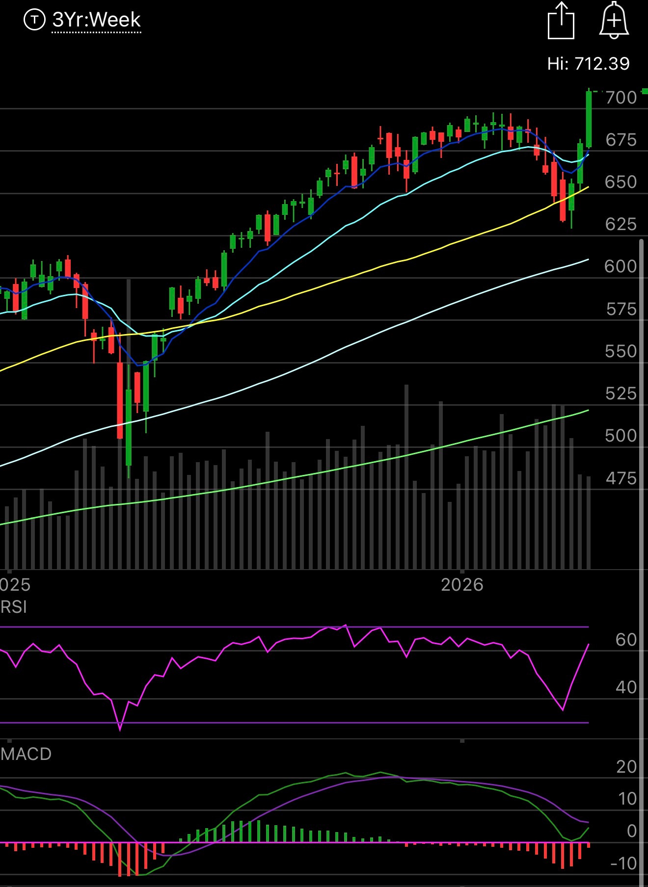 The SPY just broke the 50 week and hit new all time highs 3 weeks later. For some context, it took 27 weeks to do that during the covid crash and even on a smaller event like last years tariff crisis it took 16 weeks, so are in the midst of a legendary comeback for markets. It just shows the appetite from investors to be long into this AI boom when the markets somewhat normalize with war fears subsiding. There is nothing bearish about new all time highs and now you have levels below to play off of should we see some sort of escalation in the war again. Now its time to see if earnings and the big meeting Trump has coming up with Xi can deliver.