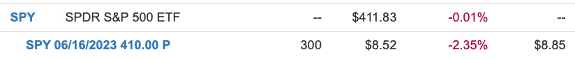 How did I play it? Conservatively. I used June $410 puts on SPY. I bought 300 of them and paid $8.85 per.