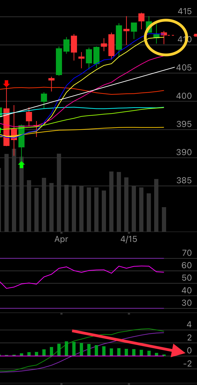 The SPY is testing below the 8 ema( yellow circle) for the second straight day. Typically when this begins its a sign of weakness which will play out. If you notice we had not tested below it in some time