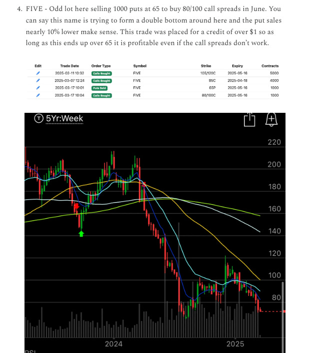FIVE - In the 3/17 recap here I flagged this weird risk reversal as FIVE looked to be falling into the abyss, it has turned around sharply and rallied about 8% in the past 2 weeks in the market weakness to nearly 82. This player nailed the bottom on this one.