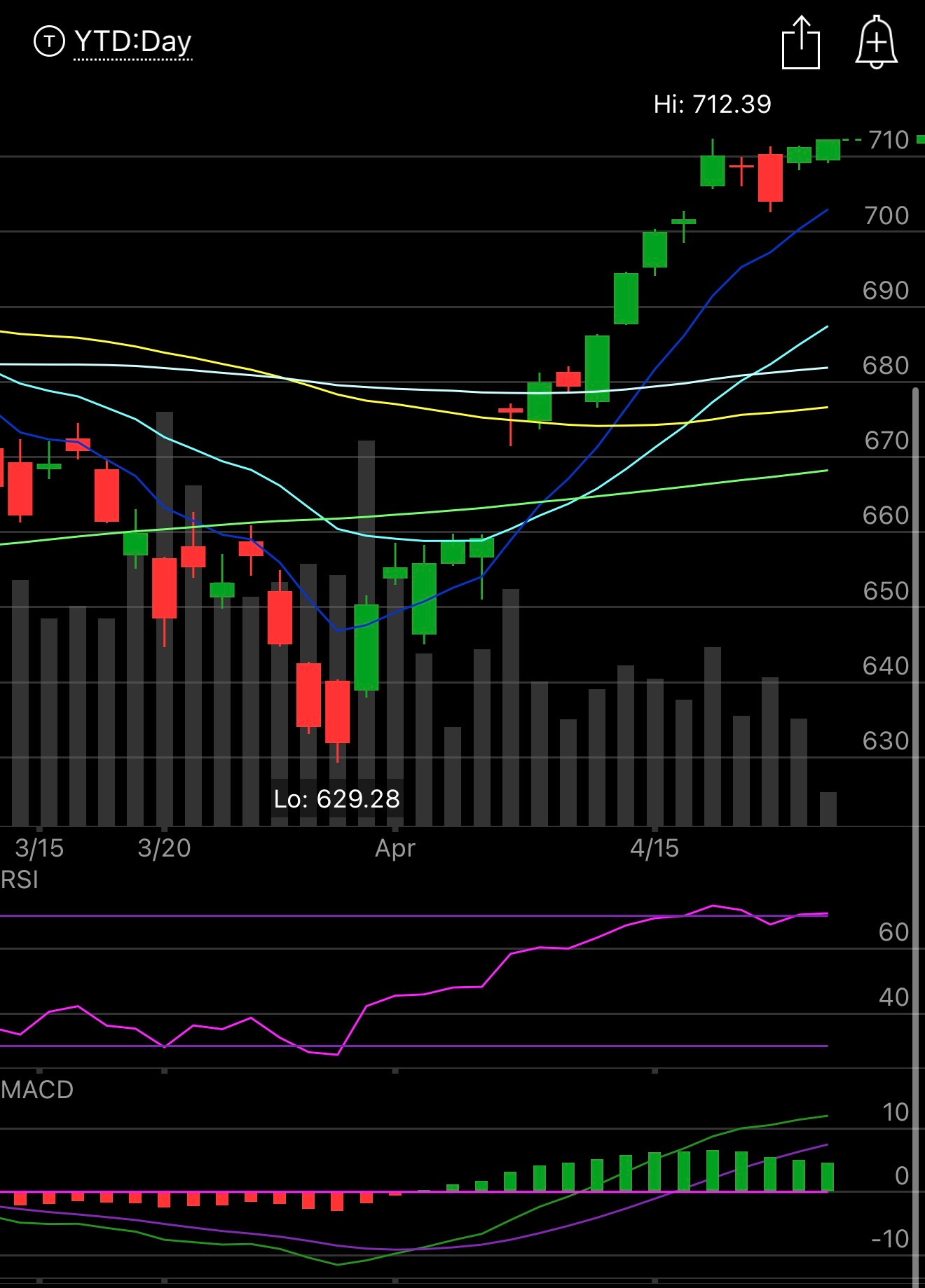 The SPY is trying to emerge from this flag its been in for 5 day. The 8 ema is over 700 now and the 21 ema is racing to catch up. Things are looking great as we’ve quietly put the war on the backburner. We need things to stay this way and the market has told you for 3 weeks the war was over, the day we crossed that 200 day below with that that huge gap up. Even economic data hasn’t really mattered recently as the whole trade was just one big catchup after the 45 days of panic. I’d like to see that yellow line, the 50 day start to curl up soon to really confirm things but this rally is only 12 days old so it needs time. Price action is truth is what the chart below should tell you because we lingered under that 21 ema on the SPY from the time the war began, the day the ceasefire hit was the first day we turned on the otherside of it and we never looked back. I always tell you that’s the best barometer in the market and with this conflict it literally told you when it was over. These rallies lock out so many because so many think news is important, the chart is the chart, it doesn’t lie to you and its been 12 days since we touched the 8 ema that is an incredibly powerful rally but for the second straight down some caution flags are flashing with VIX up and oil up.