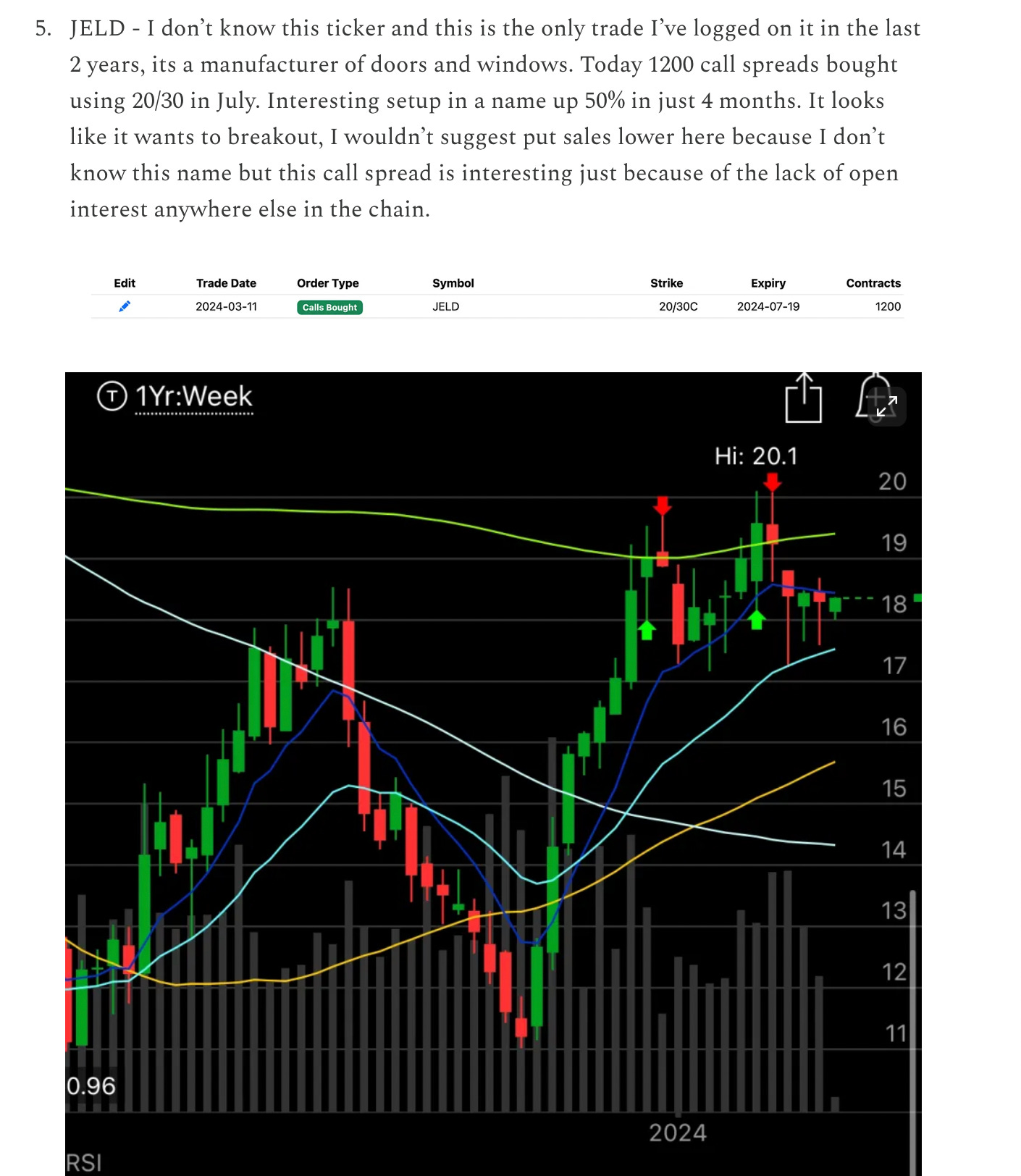Another name today that is up out of nowhere is JELD, I don’t see any news but its up 11% to nearly $21, I highlighted it back on 3/11 when some weird call spread came in and the stock was just over $18. This name has completely bucked this selloff we’re in.