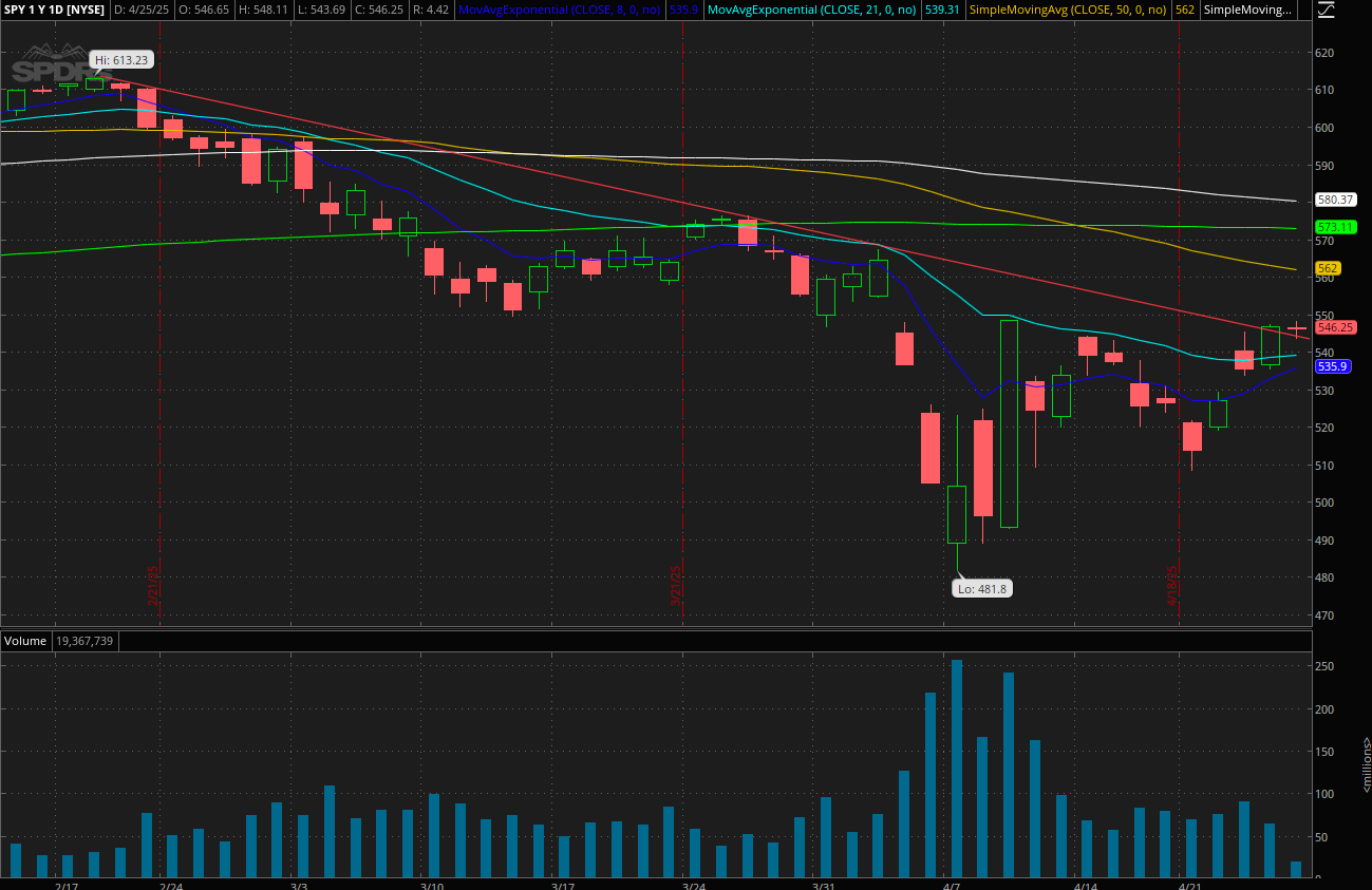 The SPY is finally breaking out, but on very low volume. Are the 2 months of pain over? From a technical standpoint, yes, but you can also have false breakouts and the volume here is not too inspiring. We have a weekend coming up and who knows what happens with Trump and China over that timeframe. So while this is encouraging, we’re going for back to back closes over the 21 ema for the first time in months, use tight stops in case we do pullback lower. Next week is a big one, most of the megacaps are reporting, Google reported last night, and those are the names that actually move the market so until next thursday passes and 6 of the big 7 have reported, it will be tough to get a read on what is really going on. Let’s all hope for some trade deals announced this weekend or progress with China at least. RSP which is the equal weight etf of the market is down .65% now vs green for the SPY so at this moment megacaps are most of what is seeing buying in the market today and their heavy weighting is holding the SPY up. Very light volume on the options today.