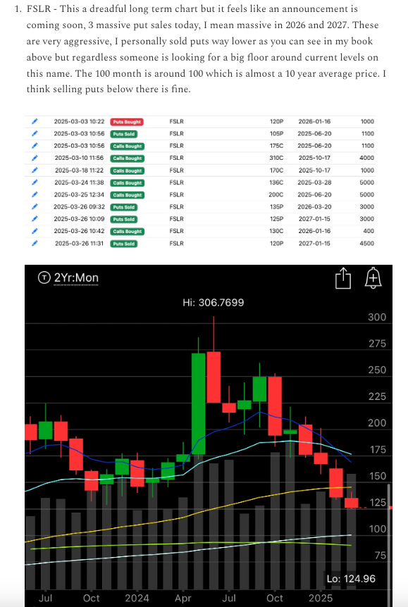 FSLR - Last week in the 3/26 recap here I noted 3 large put sales on First Solar that name is up 5% right now to 136.40 in this bloodbath, it was actually up over 8% earlier as the tariffs will keep the Chinese solar panels at bay. It was weird seeing that many put sales that far out on a name like this but today was what they were banking on as being the start of a nice trade.