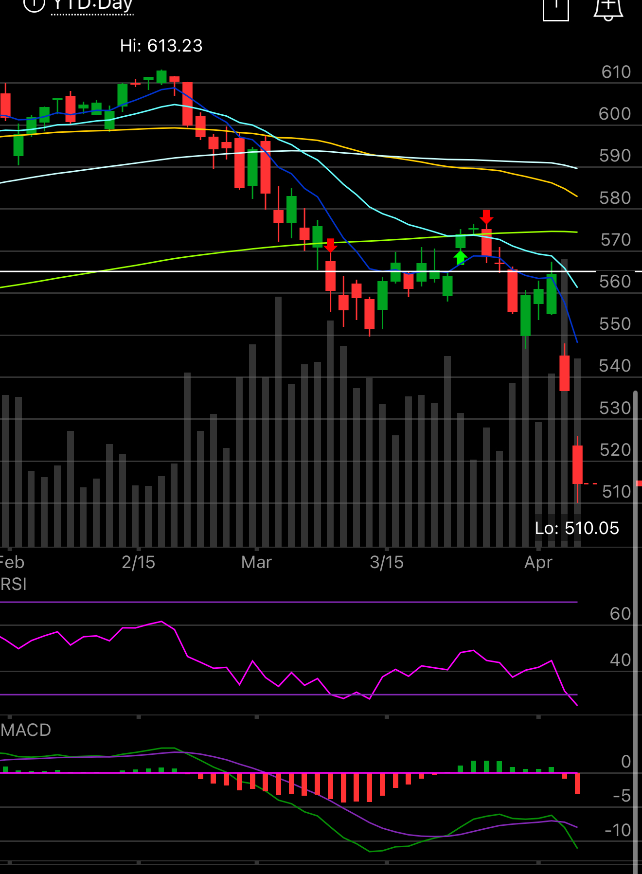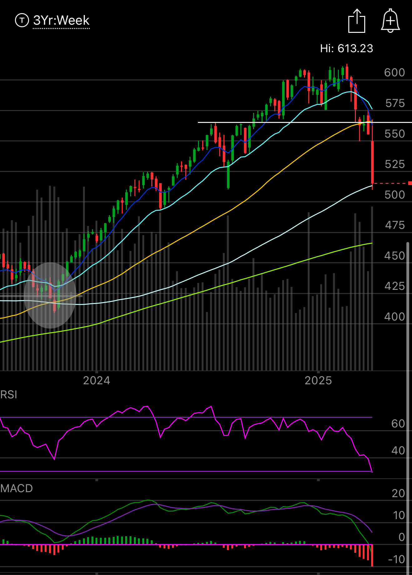 On a weekly basis we touched the 100 week today, we had not done that since late 2023 when the recent uptrend we were in began. If this doesn’t hold at 513 or so, you potentially have room to just below 475 and the 200 week.