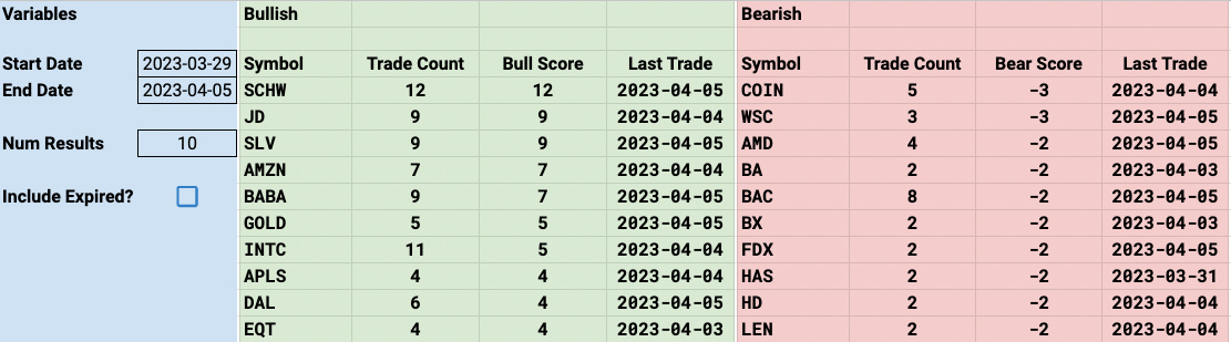 Some interesting smaller names are emerging on the shorter timeframes in these trends. On the bullish side names like APLS and EQT continue seeing short term bullish action with EQT seeing 6 unusual sized trades that were all bullish over the last 2 weeks. On the bearish side of things, the trends of the last 2 months are finally paying off as ARKK was crushed today down 4% as I type this and the second most bearish name BX is down 10% this week. What you’ll notice is very few of those BX puts came in the last 2 weeks so they were buying them all in the past and it finally paid off. That’s how these trends work, they slowly build positions in both directions and the moves tend to come later on. Hence why I remain bullish on names like SCHW,JD,AMZN,BABA regardless of the day to day action. The moves end up coming hard and fast.