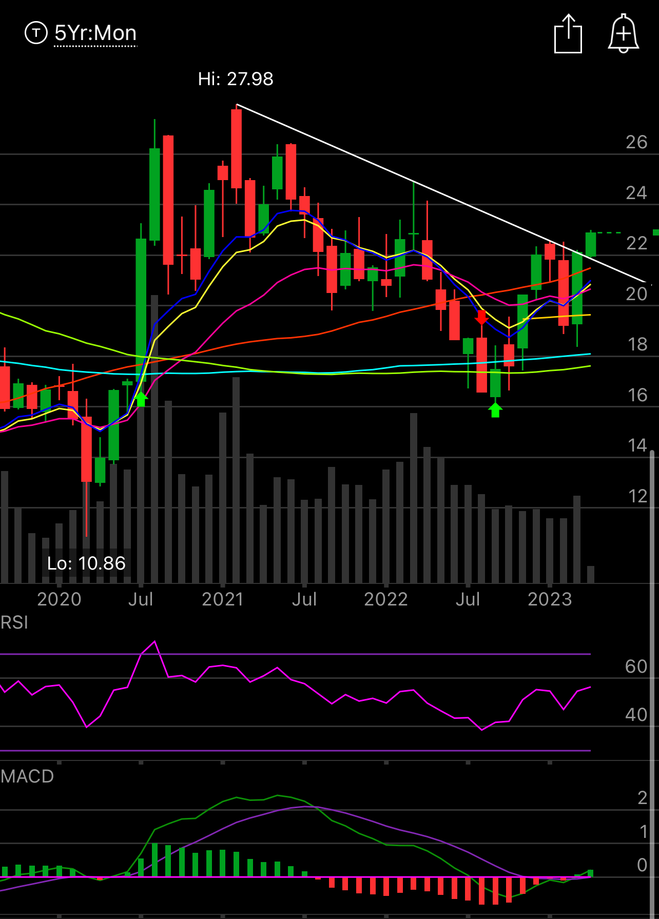 Look at this monthly chart below, that is a clear breakout on a very long timeframe. The silver bulls are finally having their day in the sun. As silver continues to see bullish activity in size everyday, it’s time to play this precious metal. The MACD on the monthly is flipping green for the first time in 2 years and we have a clear trend to use as a stop loss.
