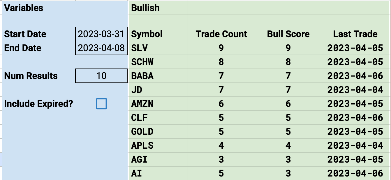 In my database over the past week, SLV was the clear leader in bullish activity.