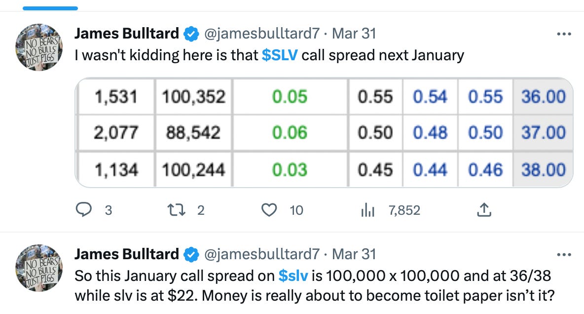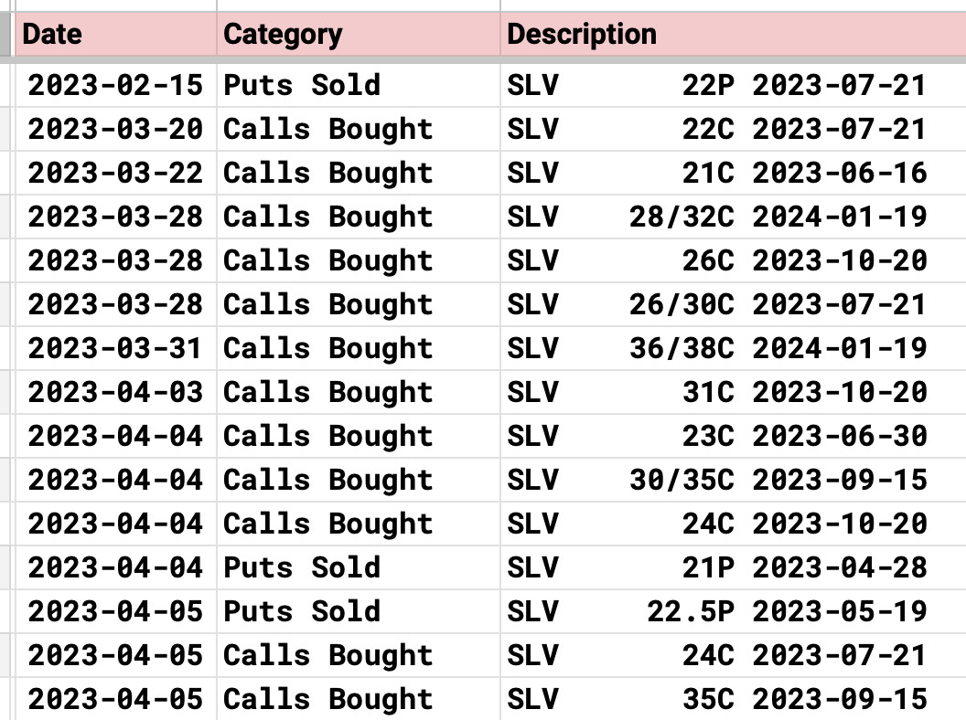 When I look at the put chains, going out to January, the $20 level should hold or the breakout failed. You could sell naked puts at $20 for $1.03 meaning your cost basis is $18.97, well below today’s price of almost $23. You could sell a put spread at something like $19/16 for a credit of .79 - .27 which is .52 that particular trade would mean you’re risking $2.48 at most to make .52 which is a 20%+ return on your risk assuming SLV stays over $19 come January.