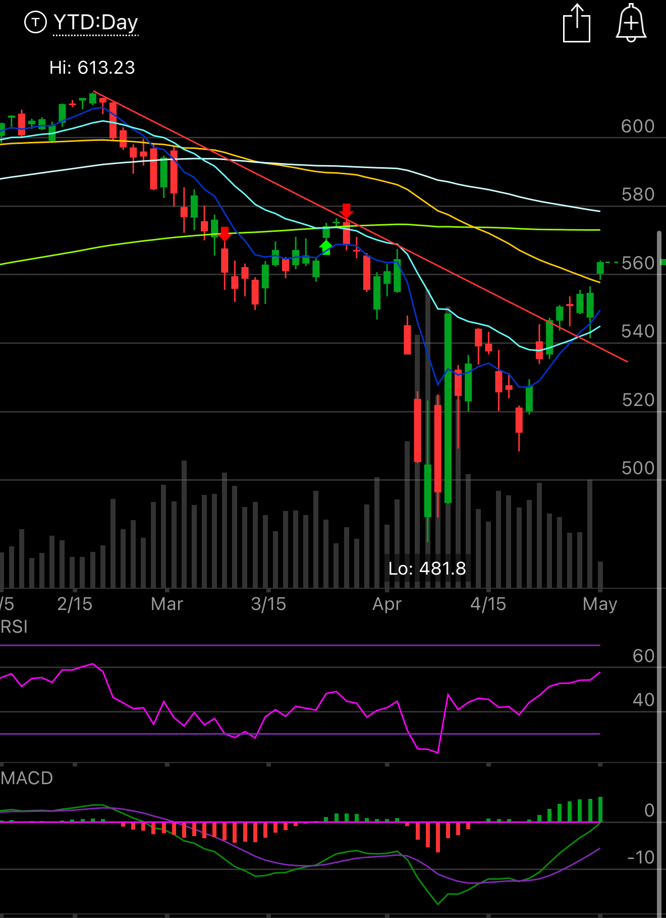 The SPY opened up over the 50 day moving average for the first time since mid February today if you need any more confirmation the downtrend was broken. Here we are 5 days into this new uptrend and things are looking good now. Microsoft and Meta both had solid reports and today we await Apple and Amazon who hopefully won’t bring this party crashing down with some bad guidance. Now with the gap up today you can move up short puts to the gap from yesterday at 556.52. This is one of the most hated rallies on record every real world datapoint says stocks should be down but that’s why I try to look at charts and flows here and not news. The chart has been very honest with us starting with the first close over the 21 ema 6 sessions back.