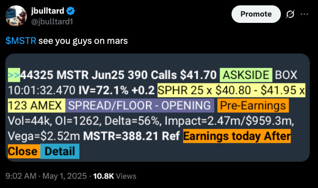 I want to mention this trade here because I don’t want you all seeing this in the table below and chasing it. This morning I tweeted at 9:02 CST posting a massive MSTR call buy of 44,325 calls bought at 10:01:32 EST and I joked about MSTR getting ready to fly because this was a near $200m trade.