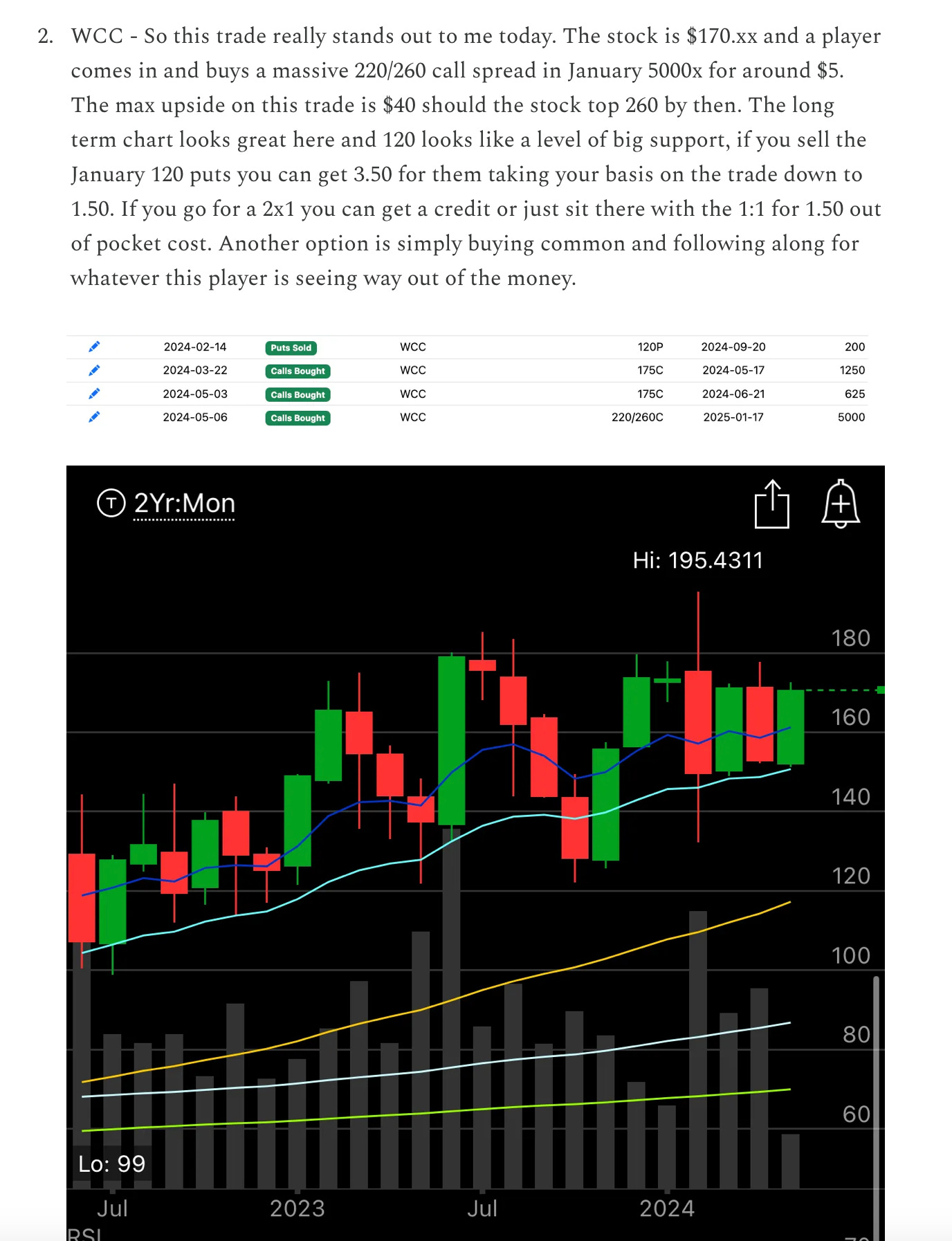 So with that said, my true best idea this week is WCC, I won’t go into more details on it, but there alot more trades added to the database since I marked the trade below on 5/6. The stock is up almost 10% since then to 185+. I think this probably still runs materially higher with those 220/260 calls out in January and I highlighted how to play it below. If you’re still in that trade, congrats. I think even commons are a solid buy here, still, with the direction of the flow.