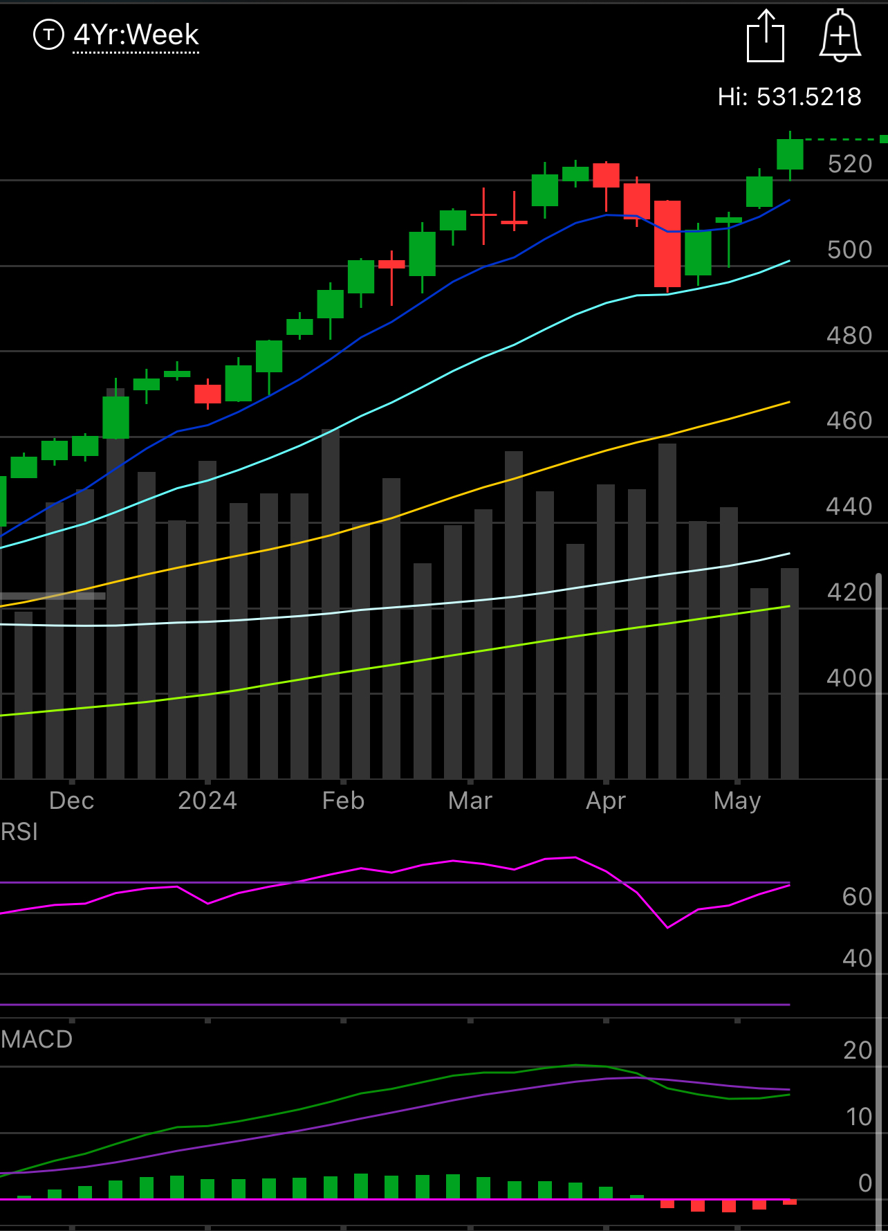 We closed last week at new highs on the SPY. There is just nothing bearish here, that breakdown we had in April went down, look at the perfect test of the 21 ema weekly and an immediate recovery and move higher. This week NVDA reports and that will have a major impact on many sectors but overall as long as you’re over the 8 ema(the dark blue line) there isn’t much to say other than be long. When that trend breaks, you lighten up/go short/whatever you want. This breakdown was by far the shortest one we’ve encountered in the past few years. Even at the time of the breakdown I told you to just lighten up short term positions but do not change your long term positioning because the reality is markets always recover, they have for nearly 200 years, why would this time be any different?