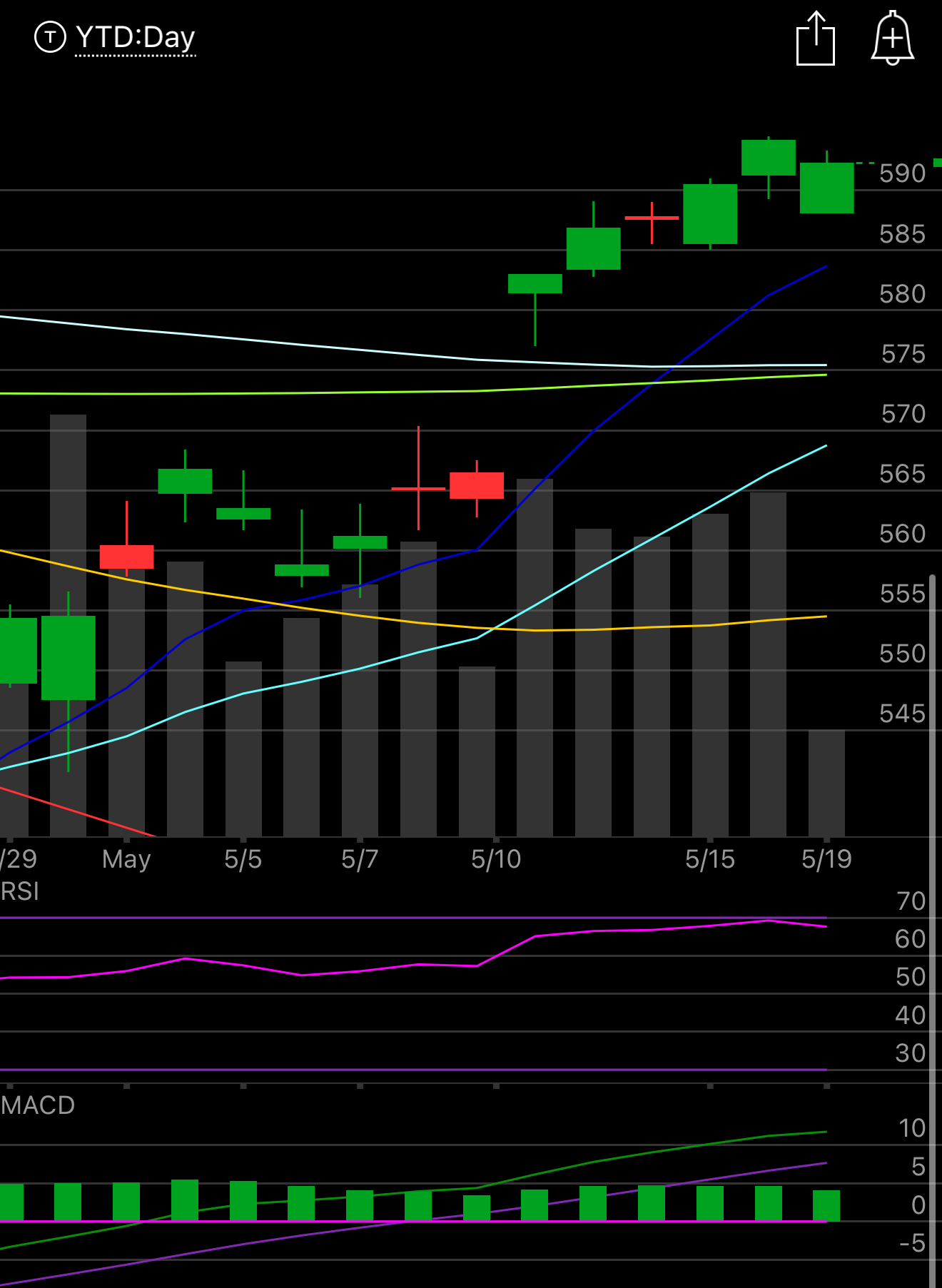 The SPY was bought off the lows after that debt downgrade friday gapped us down. We still have not touched the 8 ema in 9 sessions and are likely just consolidating here as it just catches up. We have a large gap open at 566 from 6 sessions back and that’s the level I would target if you’re a seller of short puts. We are just trending along at overbought levels and this morning it seemed like the trade war with China took a turn in the wrong direction as they were very upset with our chip restrictions which were apparently seeing changes from what was agreed upon recently. Also another headwind is the 30 year crossing the 5% mark. Going back to February Bessent said that was his main focus and rates have gone in the opposite direction. The bond market is what forced Trump to give up the tariff crusade multiple times in April and last night the bond market vehemently said it was not happy with the proposed tax bill. Going over 5% is now showing a lack of confidence in the US and its ability to repay these obligations. This is something big to watch because if rates keep pressing higher, it will absolutely matter to equities. Meanwhile Japanese rates hit 3.5% their highest point coming off a long period of zero rates. We are just seeing bond markets globally going nuts and they are not happy with these governments, its remarkable how equities seem mostly oblivious to this point.