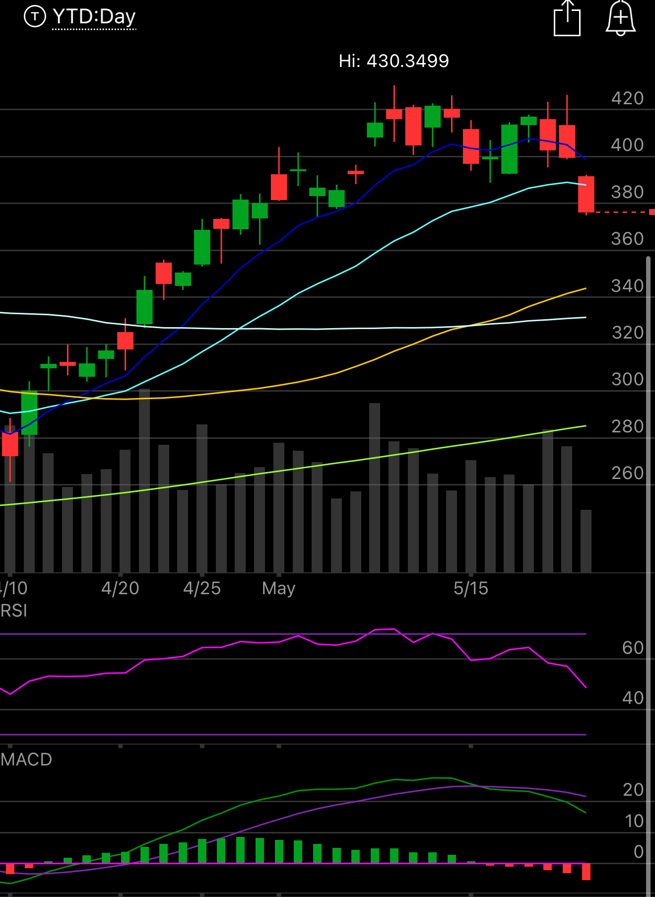 Lets talk about that MSTR position I had that I exited 2 days ago, I’ve probably saved myself $300k by selling that but let’s talk about the why. So I do think Microstrategy goes materially higher from here in time, but when I first this trade up on that weekend best idea post on 4/19 here you can see the uptrend was just beginning. We had just seen the 8 ema crossover the 21 ema and I rode a pretty clean trade from 315 to 430 at the highs and I sold out at 405. Why did I sell? 4 days before I sold out we broke the 8 ema as you can see in the chart below and instantly bounced back, that is what strong charts do. They tend to retest that move and that is when you want to exit if you didn’t the first time, so I did. That second 8 ema break was my sign this is going to break again and I sold it all. 2 days later, it is now 30 dollars lower. I did sell puts at 350 and 340 for next week because you can see the 50 day(yellow) and 100 day(white) in that range and those were my next spots of support. Today it is losing the 21 ema so some weakness should be expected. Maybe I can get put shares there where I sold them next week and ride it back up since I’m still bullish on the underlying asset they hold in bitcoin. If that happens I would have saved myself over $50/share on a large position.