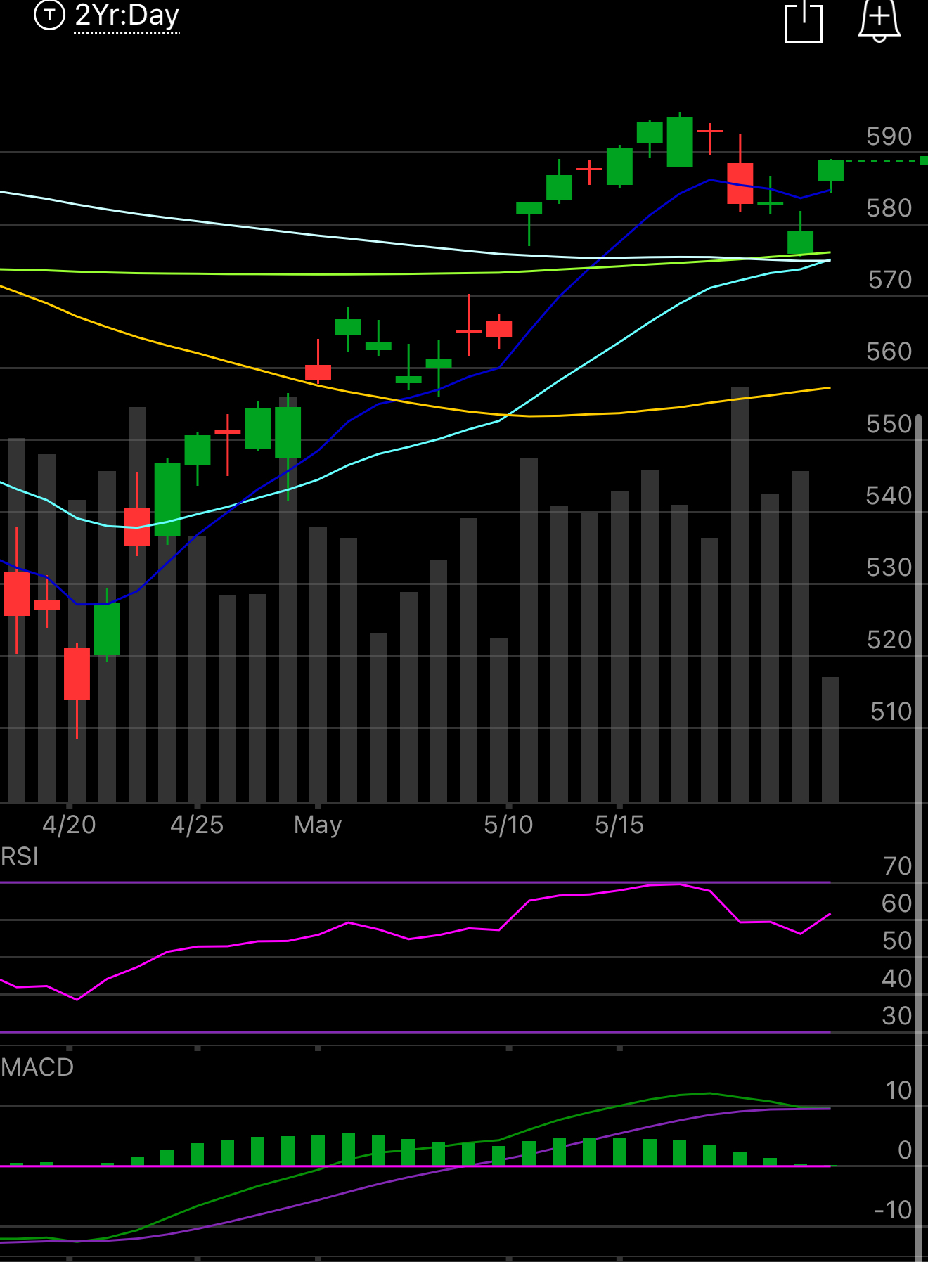 The SPY came down and tested the 8 ema this morning(dark blue) and so far it has bounced higher. Friday we had that gap down on Trump threatening 50% tariffs on the EU and he walked back that threat just a few days later causing this gap up. You’ll notice friday we held that confluence of moving averages perfectly. The SPY came right into that 100 and 200 day and they did their job as support. There really isn’t much to say here other than we retested a big spot friday and held, as long as that 200 day is holding, we are in an uptrend. That gap below 570 is concerning and I’m sure it will fill at some point in the future, but for now we’re riding over all the key moving averages and barring some Trump tweet sending us lower, right now market participants are willing buyers. Until we push up over those 613 highs from earlier in the year there is always the possibility this is just a lower high, so keep that in mind and just stay long over the 200 day, and close out your longs on a close below that.