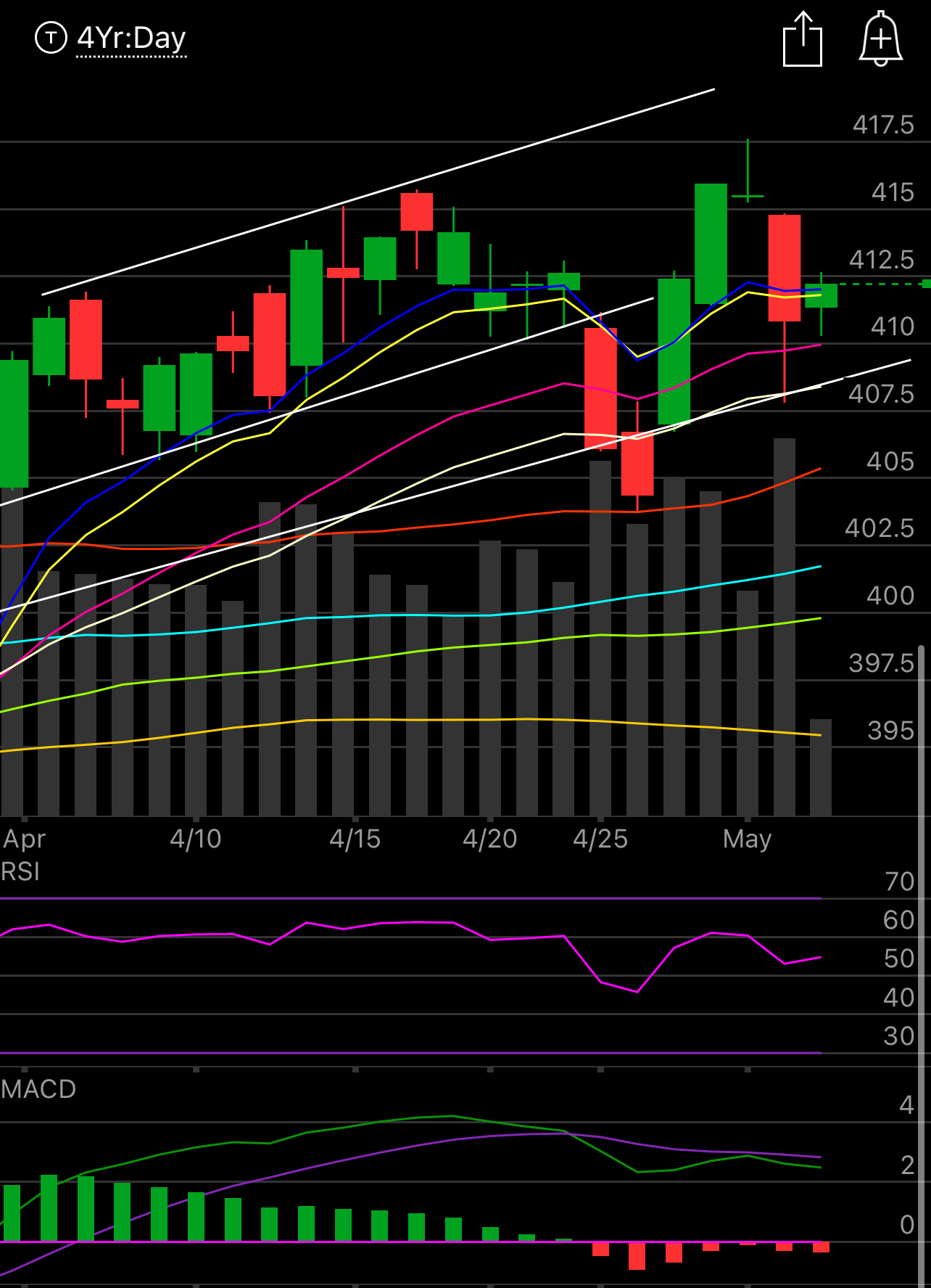 For the time being bulls do not want to see the SPY lose that white trendline below. Today is an inside day consolidating within yesterday’s big move down. The market is pricing in around a 1% move today. You can see a small bearish divergence forming on the MACD below with the market green today. Keep an eye on that, 4200 has been a stiff resistance for the SPX to breakthrough. It’s going to take alot to get through it.