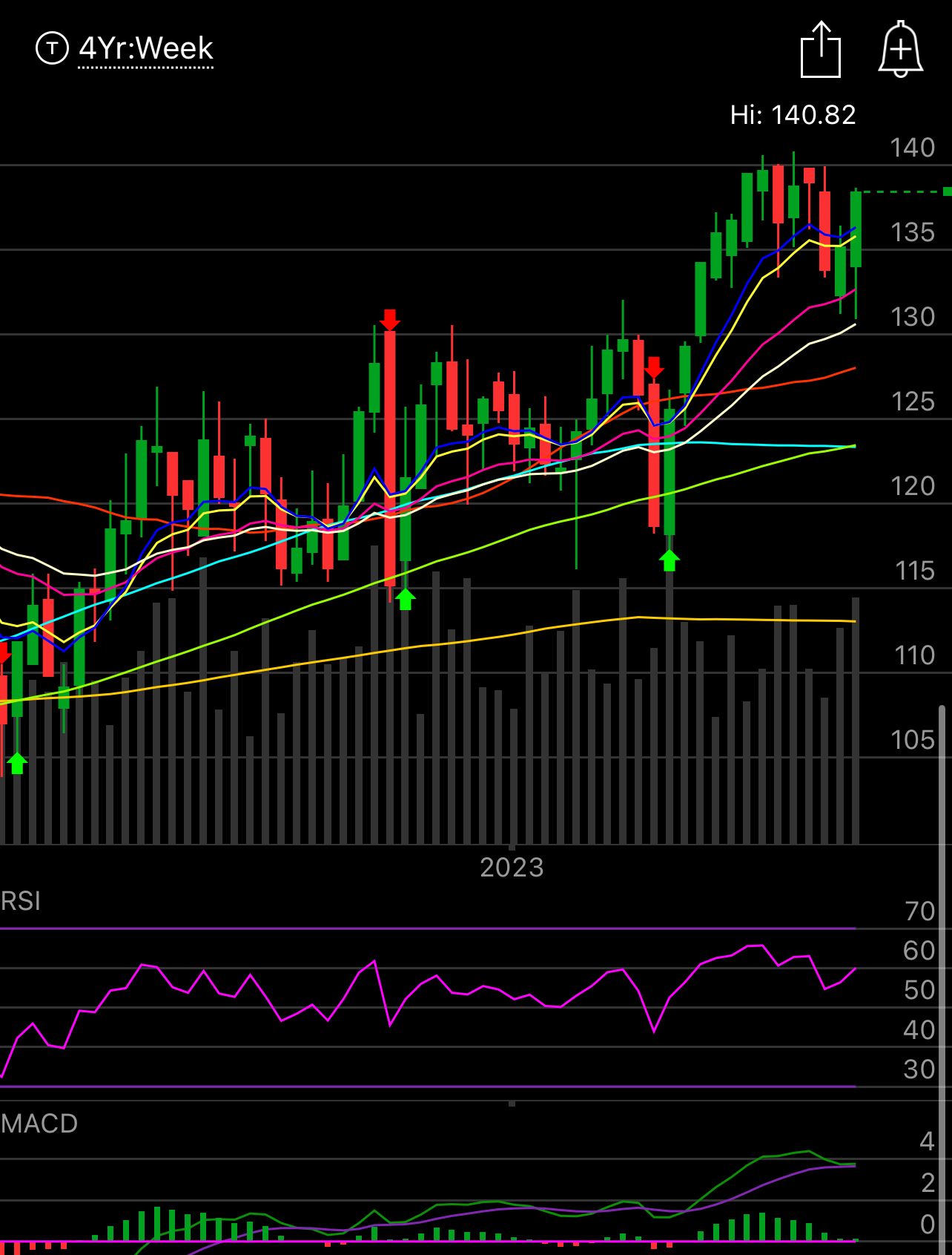 Again if you’re looking for short term trades, apply the same concepts to daily charts, I like the weekly/monthly/quarterly charts when looking for a longer term hold/trend. I am using the weekly here. Remember, never run out and buy a stock, even these, always sell puts to enter a position and let the stock come to the level you want.