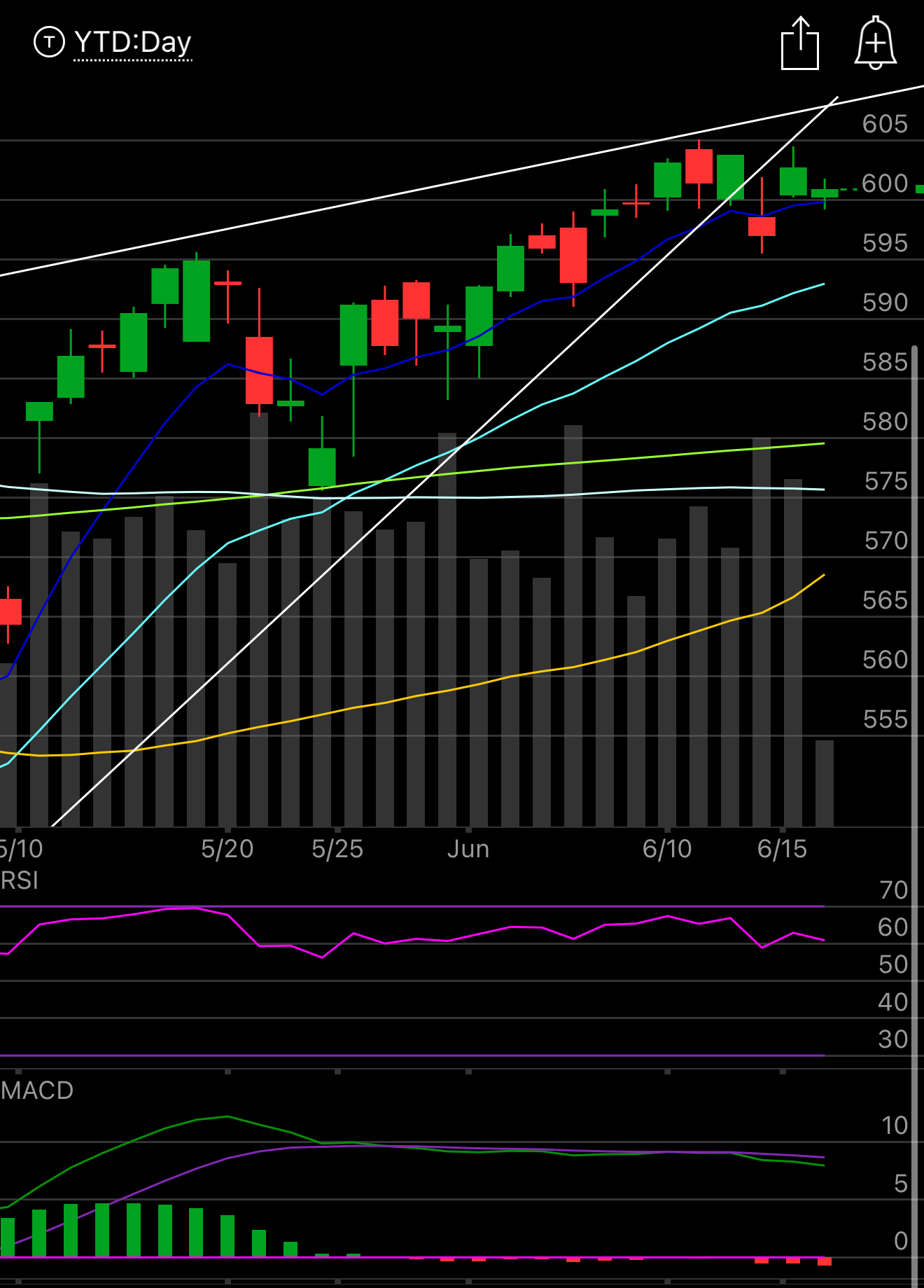 The SPY has been shockingly resilient in the 3 sessions since the conflict in the middle east kicked off. Like I said Thursday when I took off alot of my leverage, the market isn’t just going to run away from you. Let’s say the weekend heated up and stocks tanked, you would’ve been glad you sat it out. Even now we’re back to where we were last monday so if you missed a few days you didn’t miss much. Watching the markets reaction to this point just tells me the market thinks Israel ends this quickly and there isn’t some prolonged inflationary impact. So with that in mind I put a few tech positions back on today that I’ll discuss below, but in general, the market seems pretty indifferent on the war which is really shocking to me. I still don’t think it was the wrong call to say move aside in tech for a little bit just because had the market reacted negatively it would have been bad for tech and right now you can get back in and you really didn’t miss much. You have to be prudent sometimes and the reality is last friday nobody on earth knew what was coming over the weekend and to be honest we still don’t know how this whole thing escalates from here so any positions you take will always run the risk of something going very badly with this conflict. There is definitely a bearish divergence building here but for the moment we remain over the 21 ema which is just below 595.
