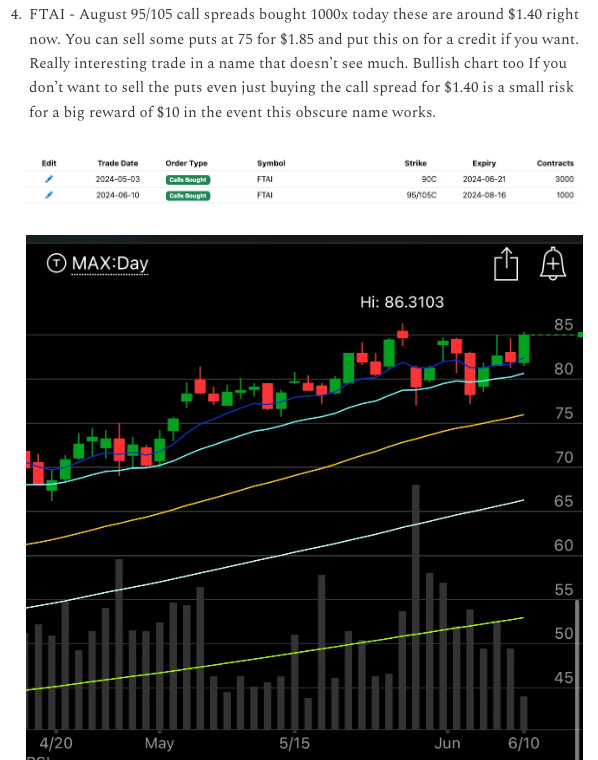 FTAI - back in the 6/10 recap here I highlighted this odd lot of 95/105 call spreads bought with the stock just below 85 for $1.40. This is over $104 right now for a quick 20% plus move up in just 3 weeks. Those calls have another 2 months until they reach full value but you could close right now for a few hundred percent. In this case, I would not hold another 2 months to eek out the last bit. If you took this, I would be closing.