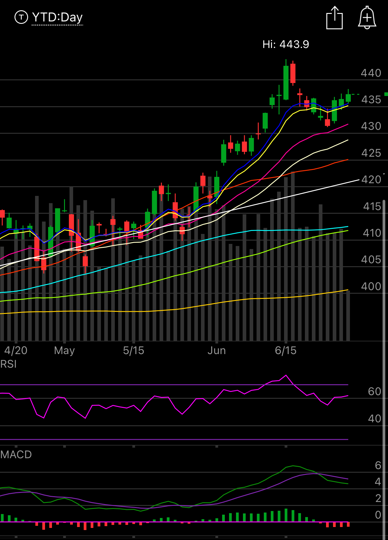 On a weekly chart you can see the well defined uptrend we have been in since last October. As long as we’re trending above you stay long, when we break below you go short, it really is that simple. In March had you gone short and set your stop at a reclaim of the trend, you would have lost a little, but you wouldn’t have been killed like these bears who are short and just ignored the trend. Look below, what in that chart is bearish? It’s over every moving average, they’re all sloping up, I understand the data is horrible but as I’ve said for months, the stock market is not the economy, those 2 do not have to correlate.