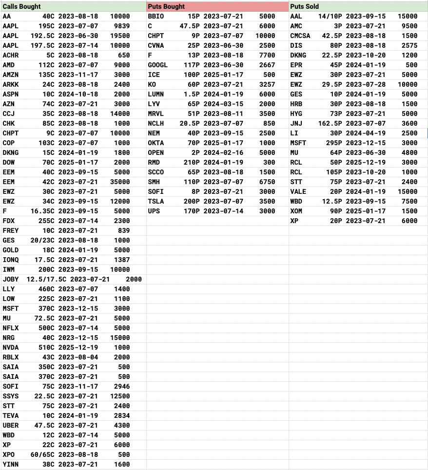 I still remain on the sidelines basically as far as I haven’t sold a put in over a month. I just can’t until the VIX pops some, I’m not in a rush to do anything at this moment I’m up 48% this year coming off an incredible 2022. The S&P as good as it has been is up just under 15% so I can’t complain being up 3x it. I’m even up far more than the Nasdaq and I’m just not seeing anything other than Amazon at this moment that I see as remotely interesting in terms of consistent option flows, so I will remain on the sidelines in terms of selling puts till we can get a VIX spike to hopefully 20+ otherwise I am not pressing anything.