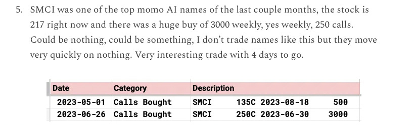 Monday SMCI calls I noted in the recap, the stock was 217 and it was 243 this morning these were up a few hundred percent