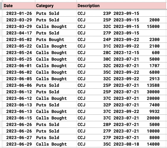 CCJ continues to see incredible action every week. This name looks great, you know I’ve liked this name for months, but it’s finally coming out of its base and the open flows in my database are still huge for such a small name. This week alone you can see the huge put sales 3x but today 14,000 calls were bought at $35 in August.