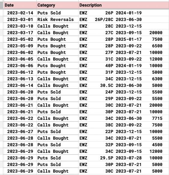 EWZ has not had a great week, but the flow of money remains directionally bullish. Today it saw a couple more bullish trades with a big July risk reversal selling $30 puts to buy $30 calls 5000x and a large put sale for July 28th of 10,000 $29.50 puts along with a buy of 12,000 September $34 calls. This remains a nice play to be in the next few months.