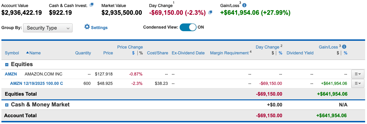 I've been curious why you aren't selling weekly calls (even way out) on your AMZN just to collect a little premium? Is it just that you feel it could run hard at any moment?