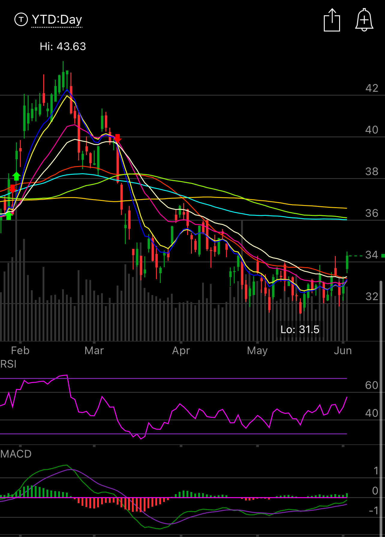I feel like we’re about to start a rotation out of the S&P 7 into the S&P 493 from here. It doesn’t mean tech is a sell but it means tech has done an incredible job and it’s time for some of the normal equities to catch up. GM made a powerful move on the daily chart friday. You can see it was coiled up below all these moving averages and finally broke above them. It has nothing stopping it between here and all that resistance at 36.