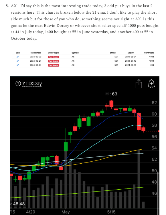 AX - In the 5/24 recap here I mentioned that although I don’t often note bearish trades, this AX was getting egregious with 3 big put buys within 24 hours. I even joked that it could be the next short seller special. Sure enough this morning, Hindenburg Research, one of the best known short sellers in the game released a scathing report on Twitter. AX was decimated and the name got as low at $40.94 premarket. If you followed this trade this was exactly what you were looking for and although it could go lower, I would be closing it up today because it is up hundreds of percent and you can’t ask for anything else on any trade. If I was to guess, someone associated with Hindenburg was behind these trades, but that’s the market today, you have roaring kitty loading up GME and pumping it, and the only way you’re going to catch accumulation of puts/calls is through options data.