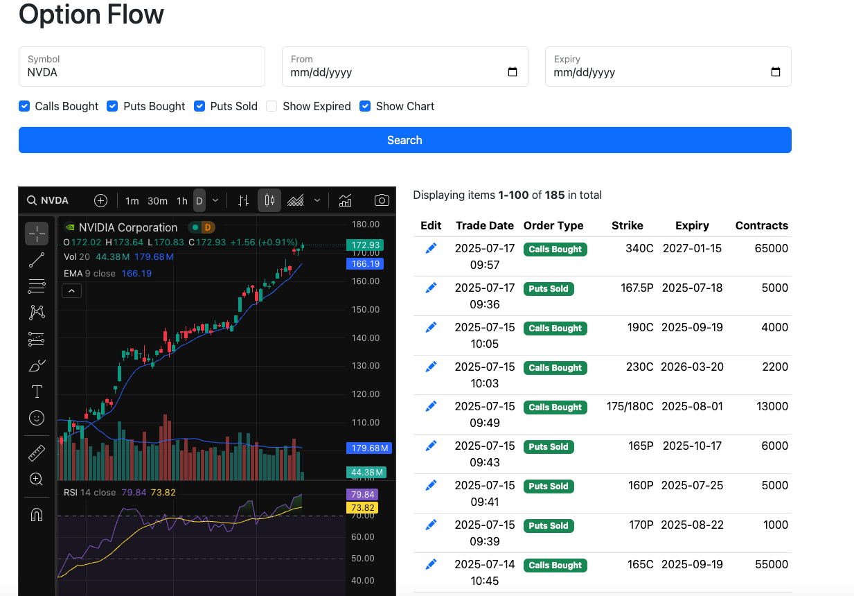 Charts - now you have trading view inside the app, for the time being until my application is approved, functionality is limited to just 3 indicators(MACD,RSI, and 1 EMA). It comes default as the 9 ema but you can adjust it to the 8 or 21 but you have to do it everytime, for now. I wanted this to make your life easier, I know most don’t have multiple screens or an ultrawide and toggling multiple screens is a hassle, here you can just search the option flow by ticker and have a chart right there that you can utilize. If you don’t like the chart you just uncheck that show chart button and you’re back to where you were yesterday. Also we had to remove the ticker symbol on the side when you click an individual name because there just isn’t enough real estate to fit it all when the chart is up. I know a few asked about that already but that is why. On mobile it doesn’t look good yet, apologies, working on it, just uncheck the show chart box on mobile for now.
