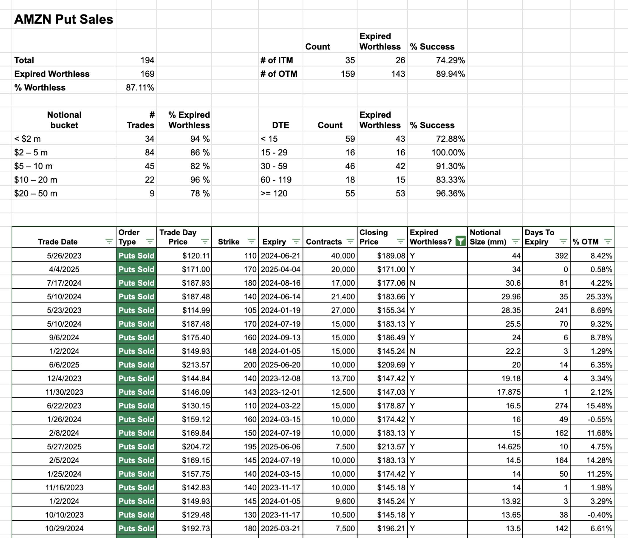 In Progress - I want to display the importance of the put sales I catalog everyday, I’ve always told you those are the most important trades in all this dataset because of their high probability of success which is why you will notice I am mostly a put seller. Down below for example is Amazon and I have logged 194 put sales over the years here and 169 of them expired worthless for an 87.1% success rate. You can see the breakdown by the notional size of the trade, days to expiration,etc. I think this is important to integrate because lets be real with call buys and put buys, we don’t know the intentions of those trades, with put sales we know that’s where someone is looking to get long which is why I think its the most valuable data to trade around. I hope to be able to have this available soon where you can see the data on all the put sales I’ve flagged. So looking at the data below you can say if I see an Amazon trade with short puts 15-29 days to expiry, if I follow that trade, to this point they’ve expired worthless 100% of the time. Very powerful.