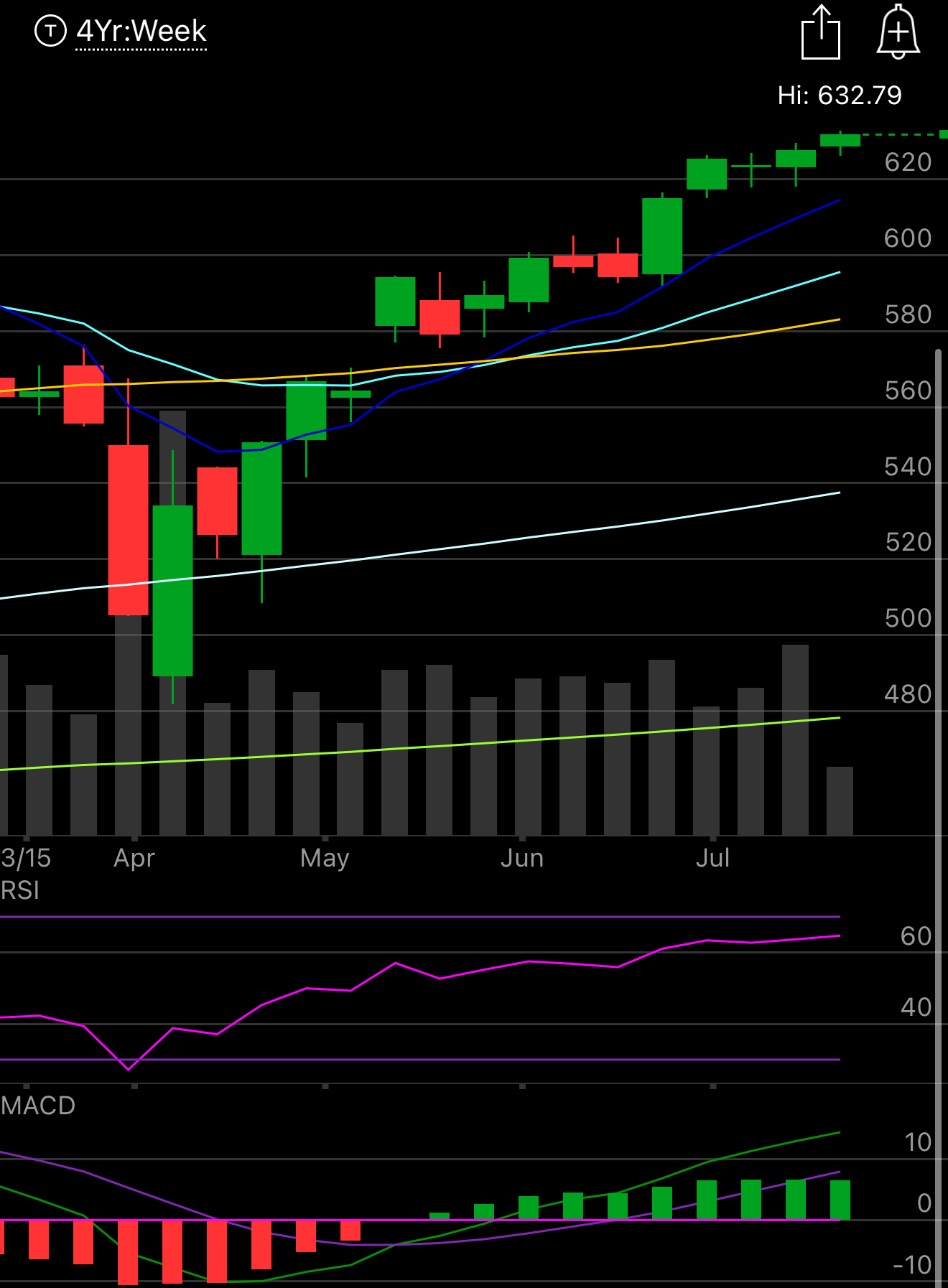 The SPY continues the melt up, today we got news of a potential trade deal with the EU sending us higher mid day. I saw a stat yesterday on twitter that this was the longest stretch since the dotcom bubble where the market has closed over its 20 day average and I believe we were at 60 days currently and that stretch was almost 80 days. The point is, this is a pretty historic run and today we have our first megacap reports in Google and Tesla. Those aren’t the most important names but how Google reports on cloud and advertising will have ripple effects through alot of names. For now we continue this slow drift higher as this trend is seemingly unbreakable to the downside everyday.